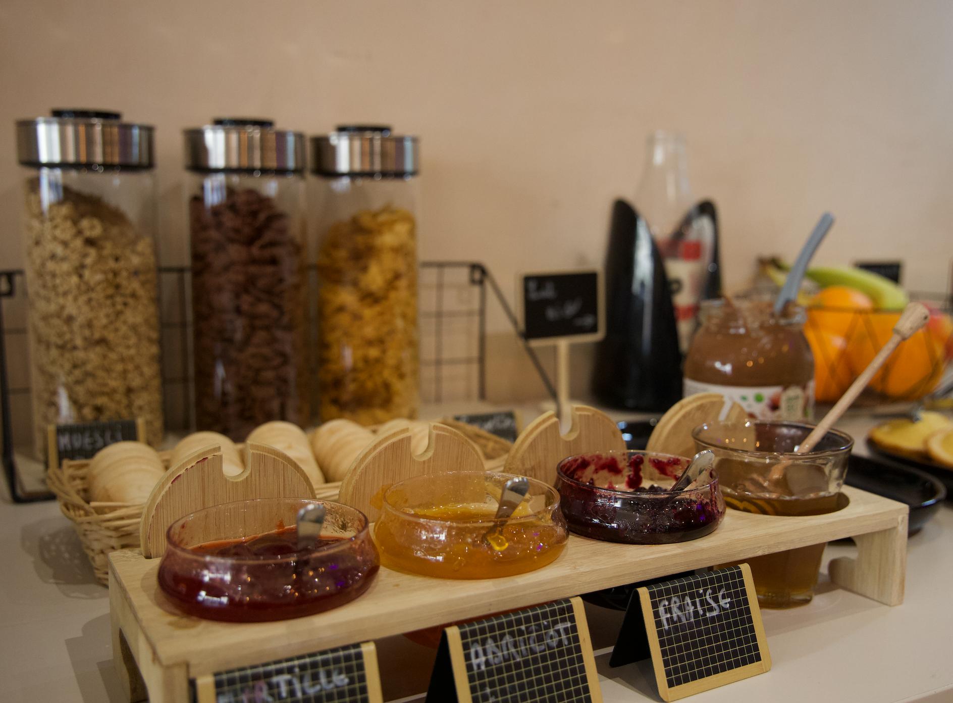 Le matin, le petit-déjeuner en buffet à volonté (viennoiseries, fromages, charcuteries, céréales, plats chauds…) est dressé jusqu’à 10h00.