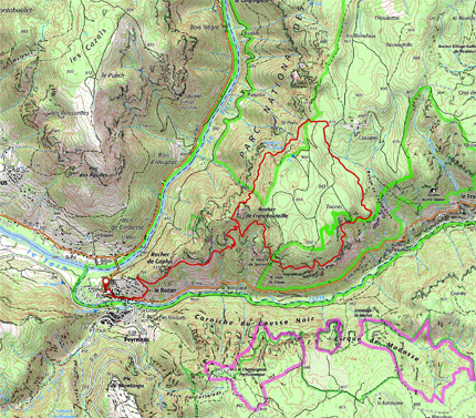 3. Sur la gauche des escaliers montent en direction du sentier Jacques Brunet, il s’agit d’une variante plus escarpée qui rejoint le sentier des corniches après le col de Francbouteille. Sinon continuer de suivre le sentier qui remonte les gorges. Arrivé dans une partie boisée, continuer de monter le long des vingt-deux lacets du ravin des Echos et ignorer le sentier qui descend sur la droite. Au carrefour, prendre à gauche et grimper jusqu’au col de Francbouteille.