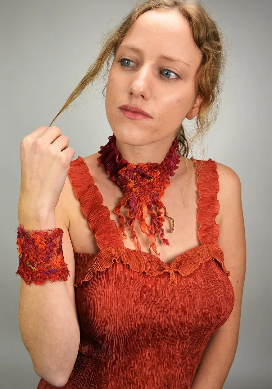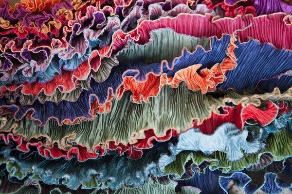 Accessoires de mode et vêtements en tissus plissés. L’harmonie des couleurs et des matières est riche et étonnante. Féminin et joyeux, c’est tout simplement du plaisir à porter !