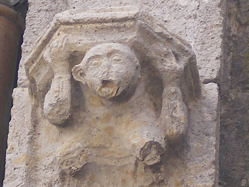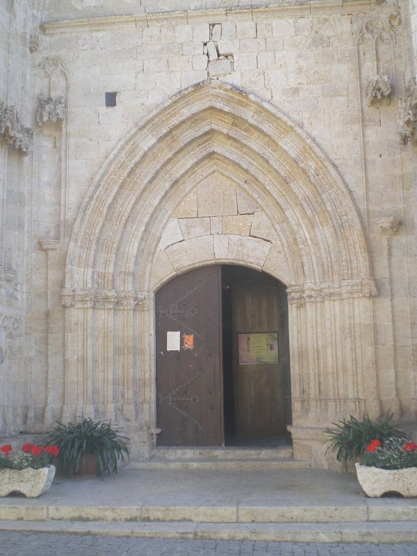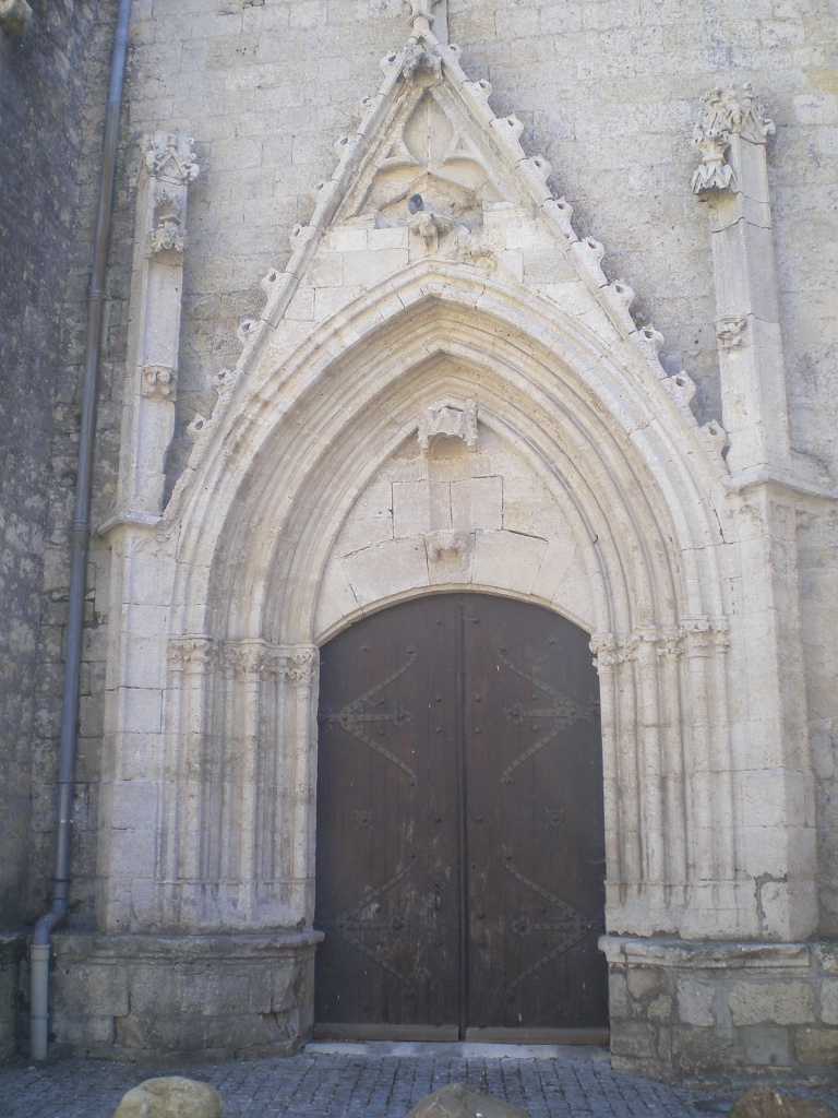 Le porche monumental très haut, à 4 voussures, comporte un tore (grosse moulure) encadré d’une ligne de chapiteaux début 14ème à fleurs, et de niches aux statues brisées par les guerres de Religion ou à la Révolution. Un enfeu jouxte ce grand porche.