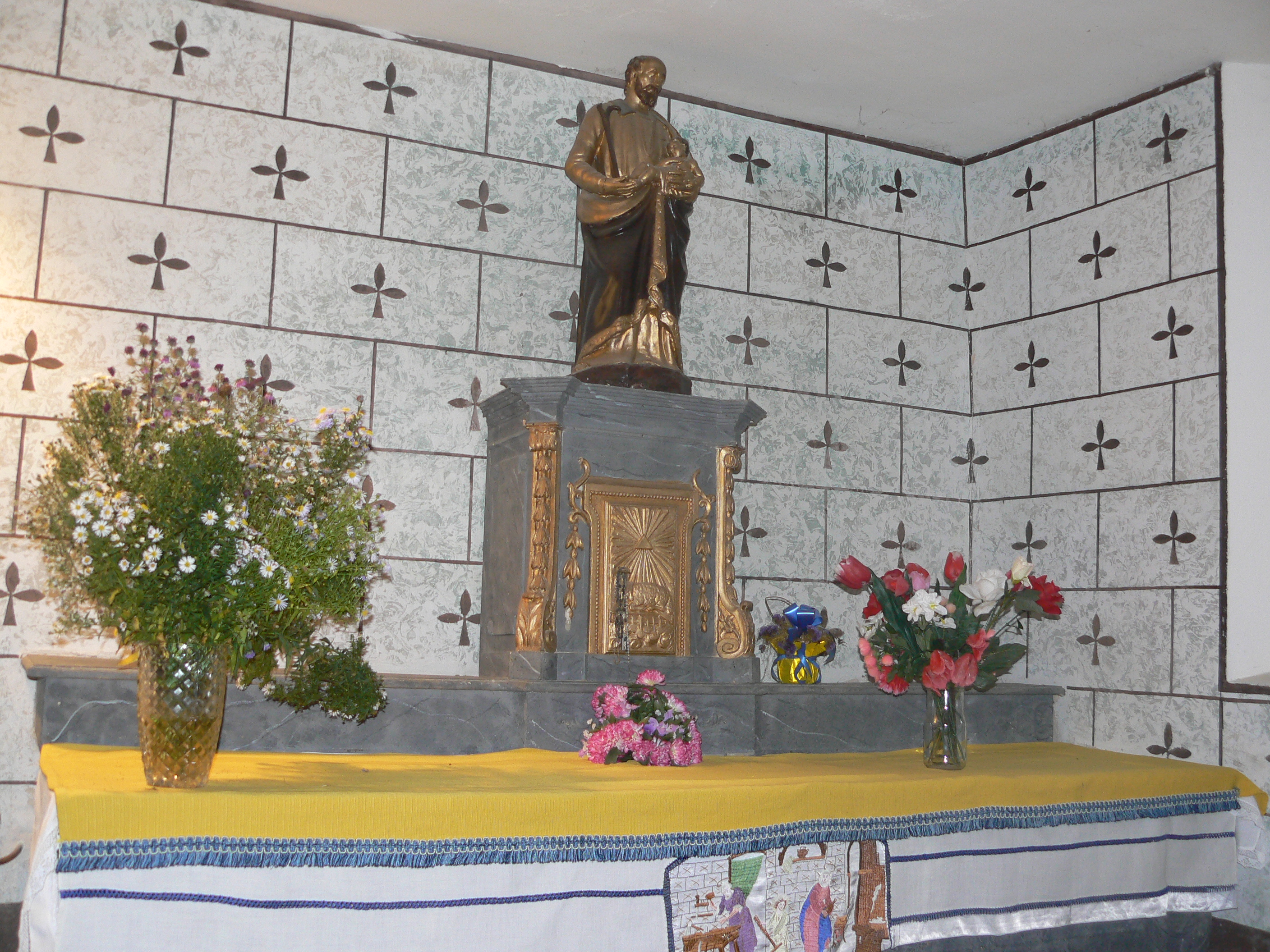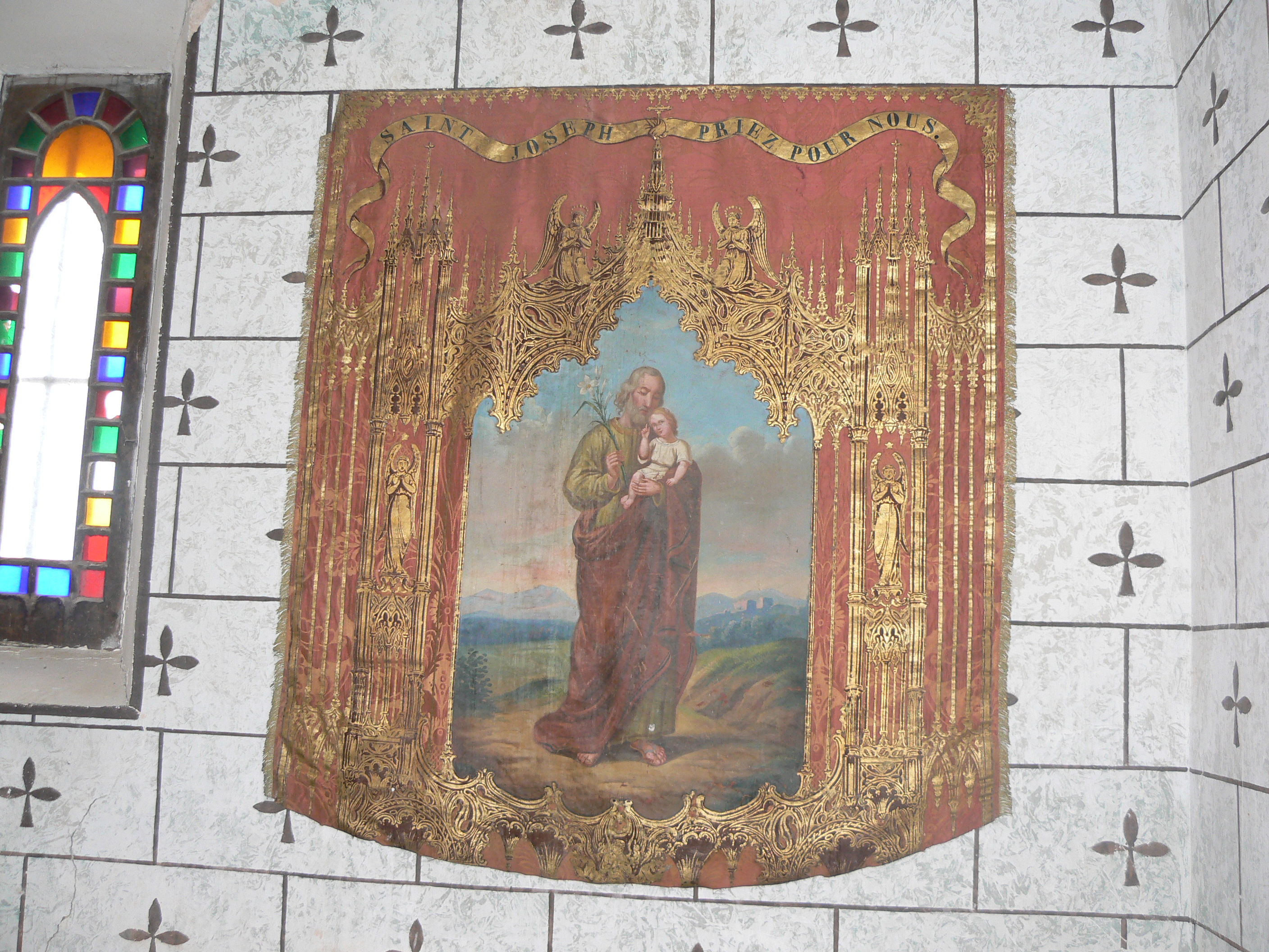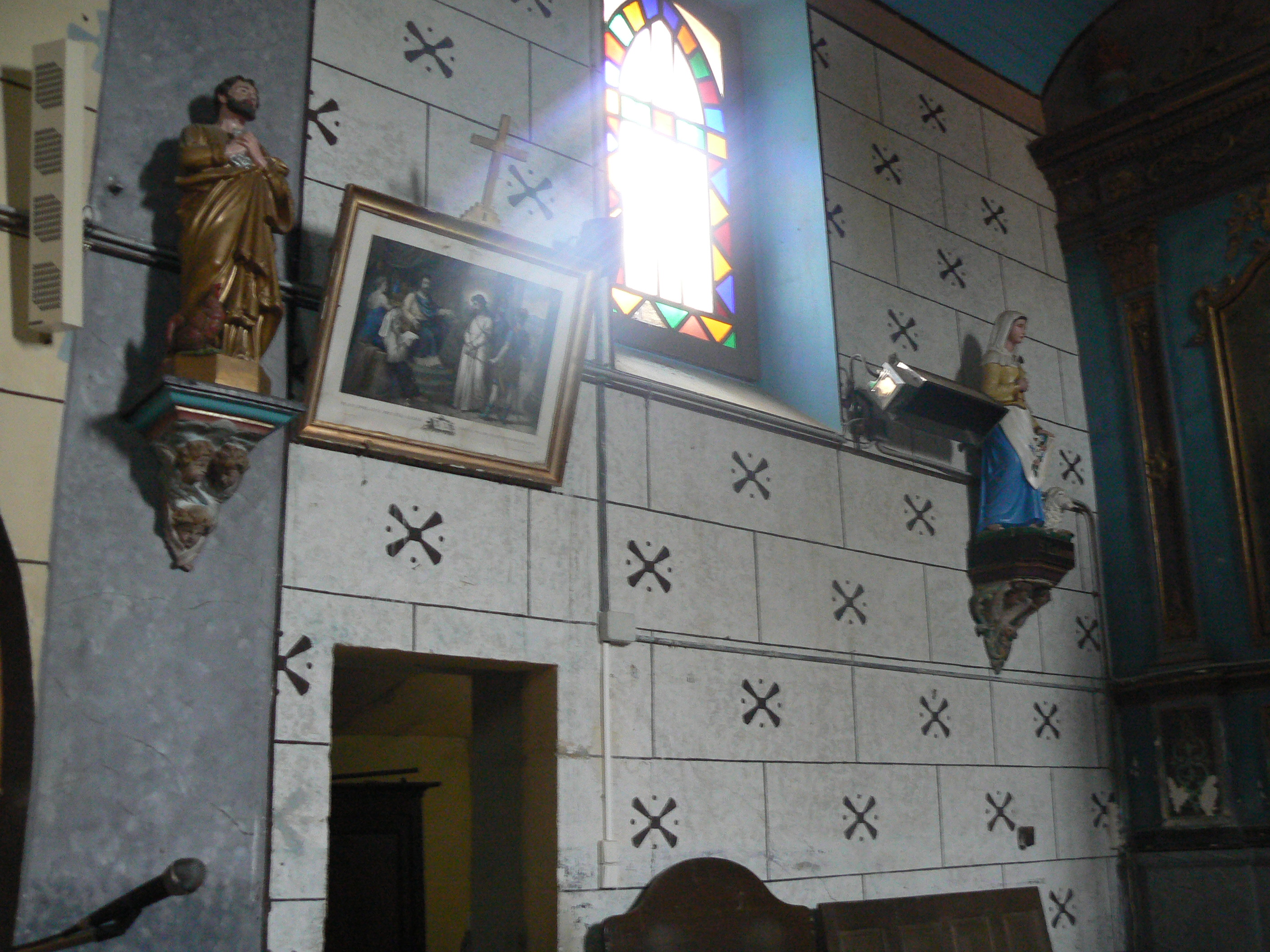 La nef unique est éclairée par 4 fenêtres cintrées. A l’ouest, un escalier monte à la tribune. Le plafond est lambrissé, les murs décorés au pochoir. Deux arcades cintrées ouvrent sur les chapelles de la Vierge au nord, et de St-Joseph au midi. Le chevet à fond plat est surmonté d’un lambris peint en bleu. Deux fenêtres à verre coloré illuminent le chœur.