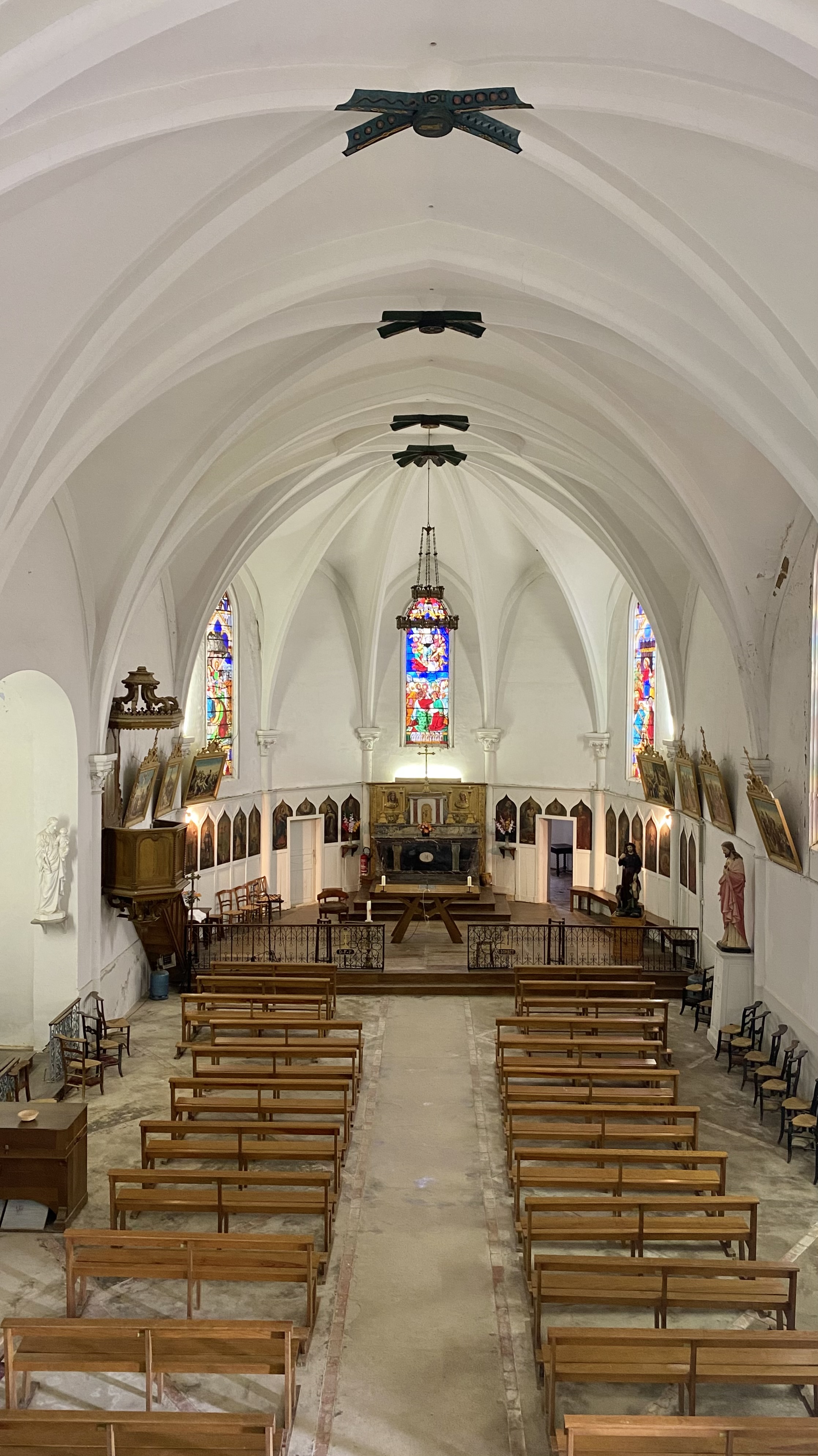 À l’intérieur, le chœur est décoré de vingt-deux peintures réalisées en 1838 et 1839 par l’artiste gersois Thomire. Trois vitraux remarquables illuminent le sanctuaire, représentant l’Adoration des Mages, la Cène et l’Assomption de la Vierge. Ces œuvres confèrent à l’édifice une atmosphère spirituelle et artistique unique.