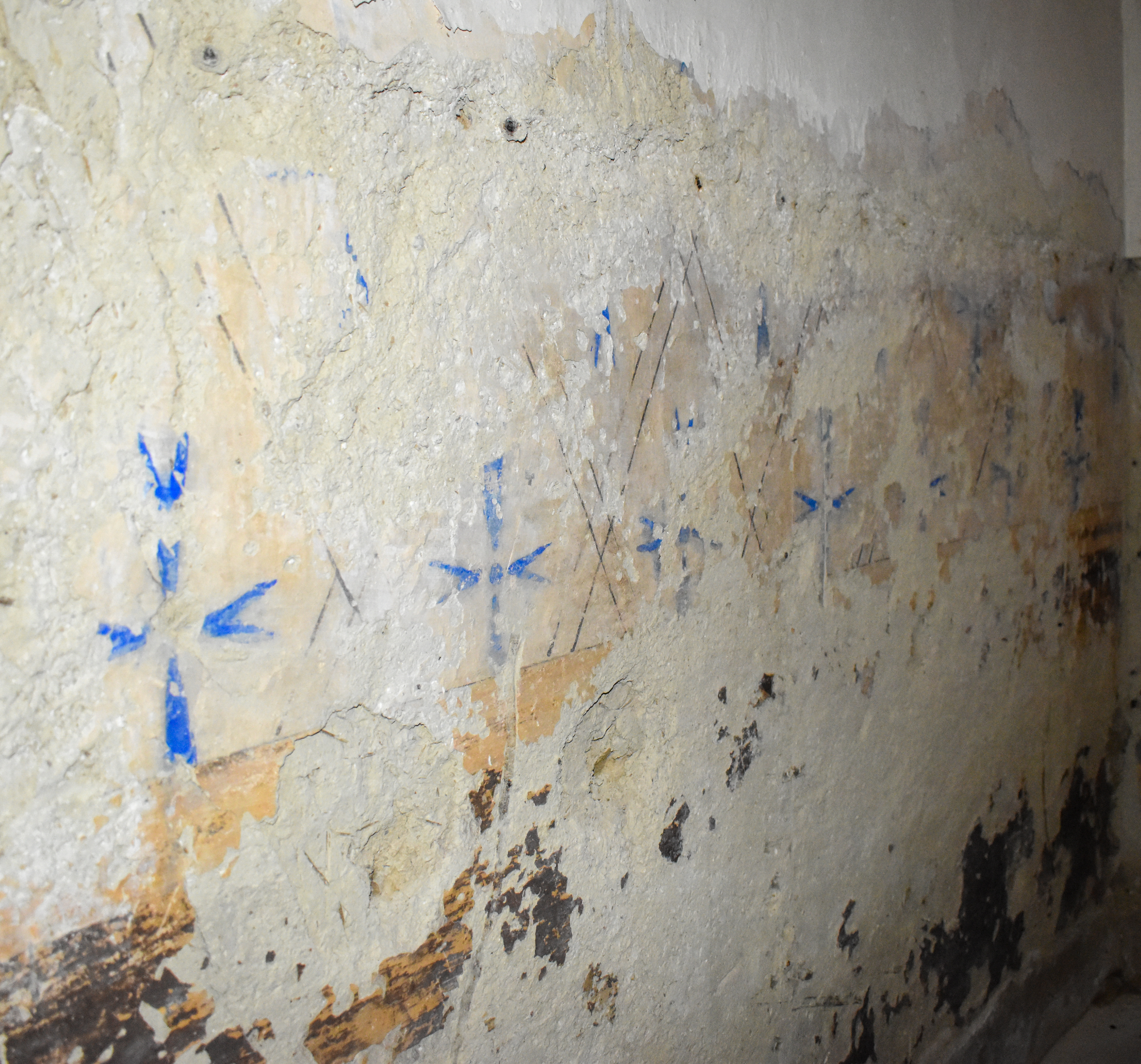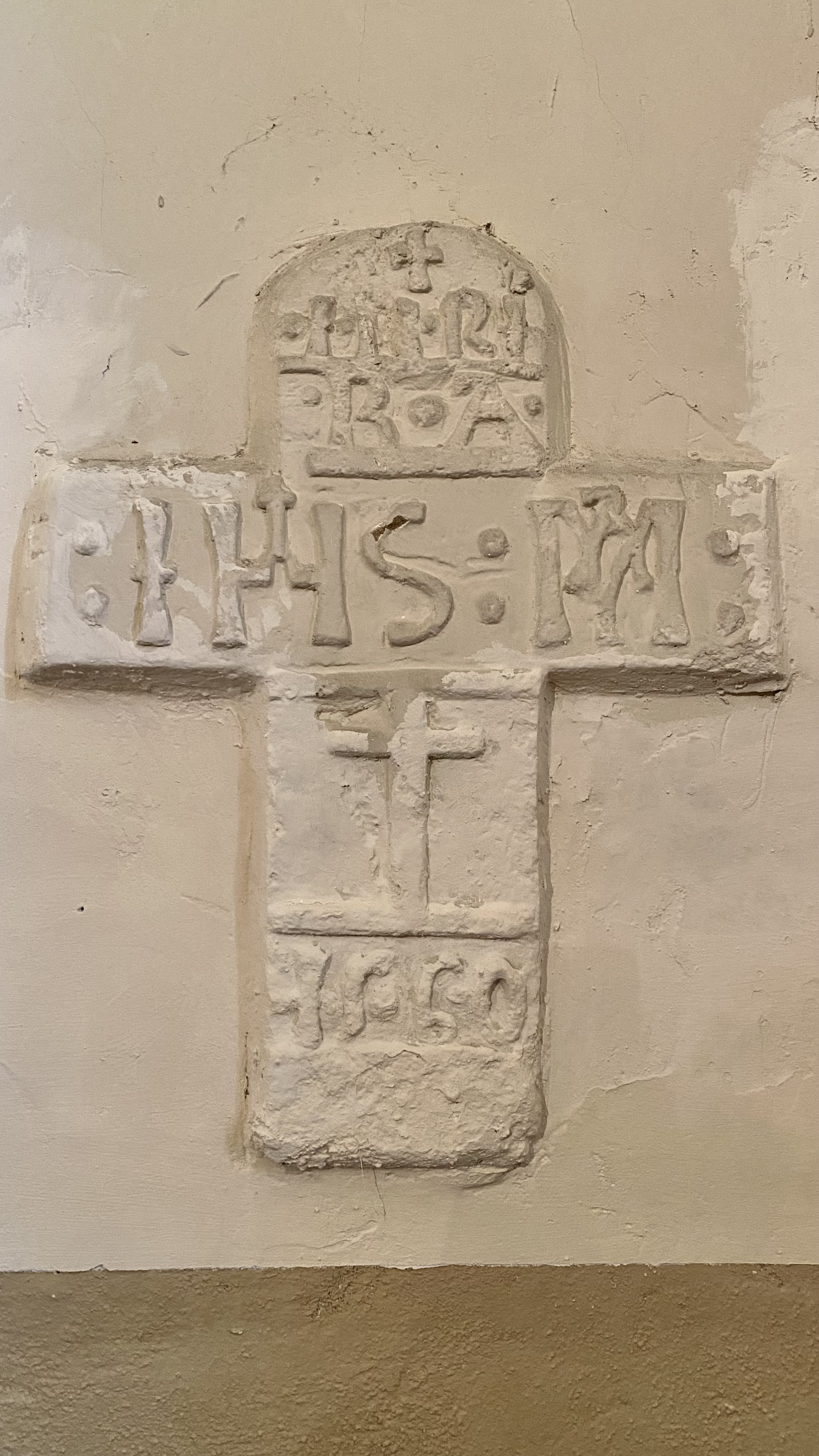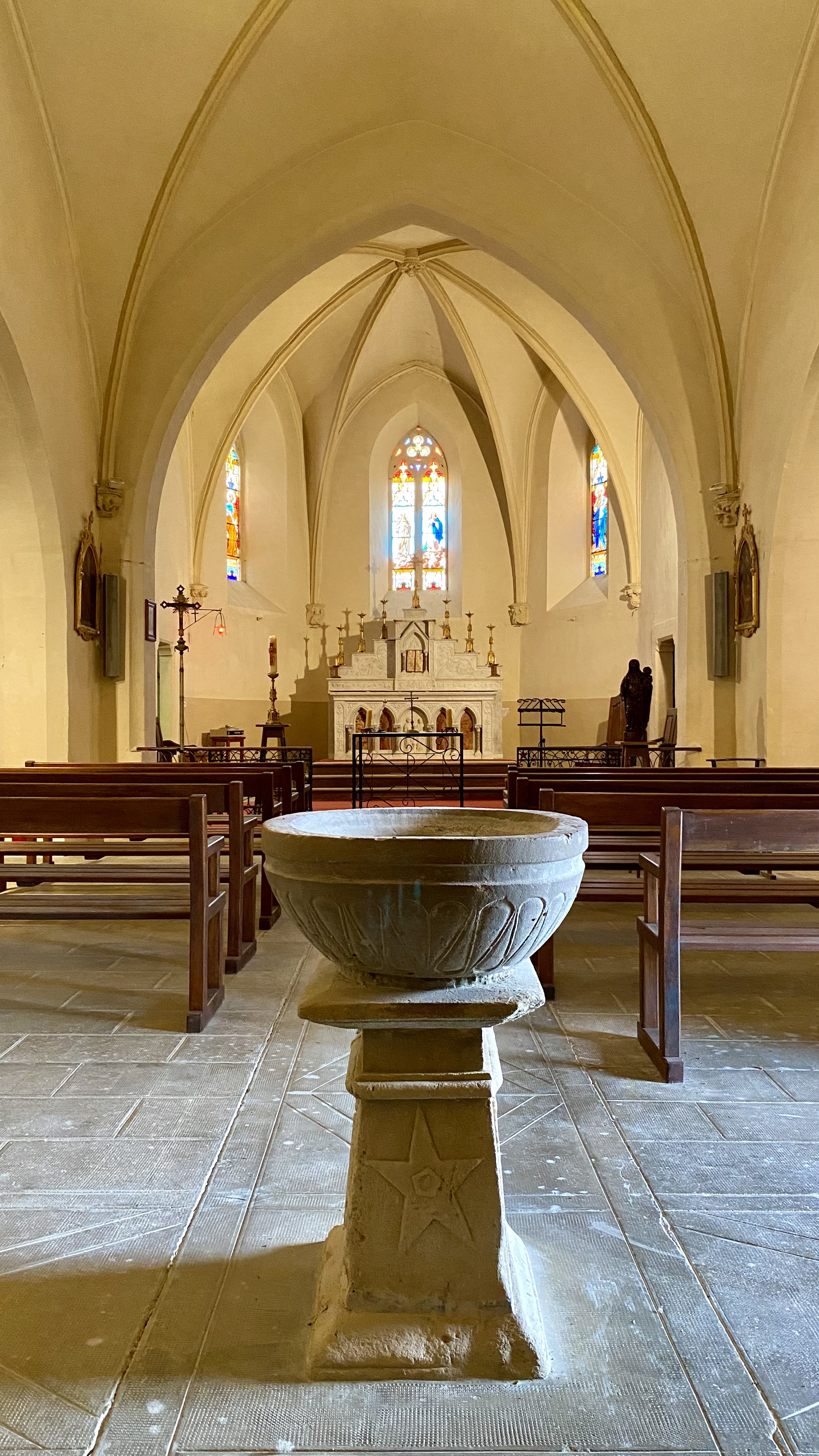 À l’intérieur, la voûte en croisée d’ogives attire le regard par ses nervures et ses arcs doubleaux reposant sur des consoles en terre cuite. Les culs-de-lampe et les clefs sont ornés d’une riche décoration sculptée : motifs végétaux, animaux, visages, anges en prière et même une tiare papale. Parmi les éléments singuliers, une ancienne croix en pierre datée de 1560 est remployée dans la maçonnerie du collatéral nord, probablement une ancienne croix funéraire dont la présence dans le sanctuaire reste mystérieuse.
