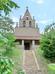 L’église à un clocher-mur à trois cloches, datant de 1757, à l’entrée du château (privé).