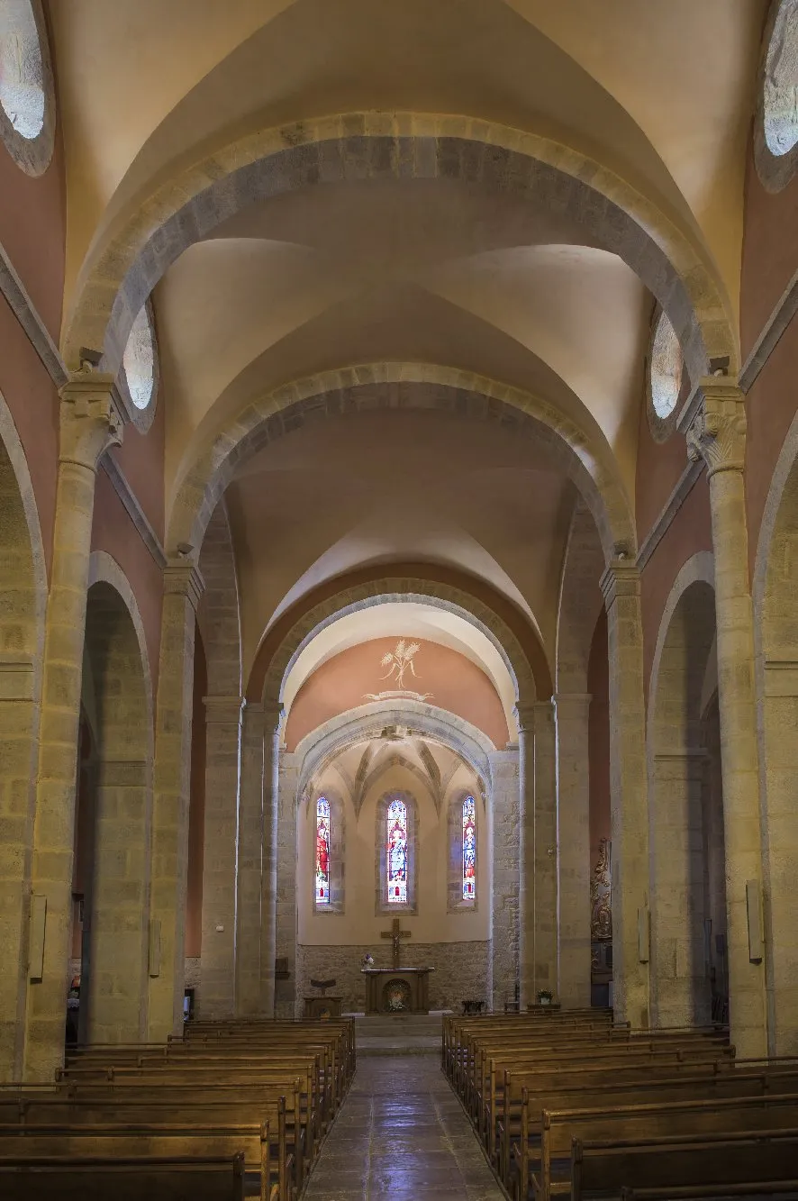 A l’intérieur apparaît une nef romane et un chœur gothique pentagonal (15e s.). Un retable représente Saint Eutrope, Patron des Tisserands, et Saint Roch invoqué contre la peste et les maladies contagieuses. Au XXI siècle, 2010-2011, la mairie et la paroisse ont fait réaliser des travaux importants : la réfection de l’intégralité des enduits intérieurs, la mise aux normes de l’électricité, la remise en état des vitraux détériorés et le remplacement de l’autel et de l’ambon et pour finir la restauration du retable.