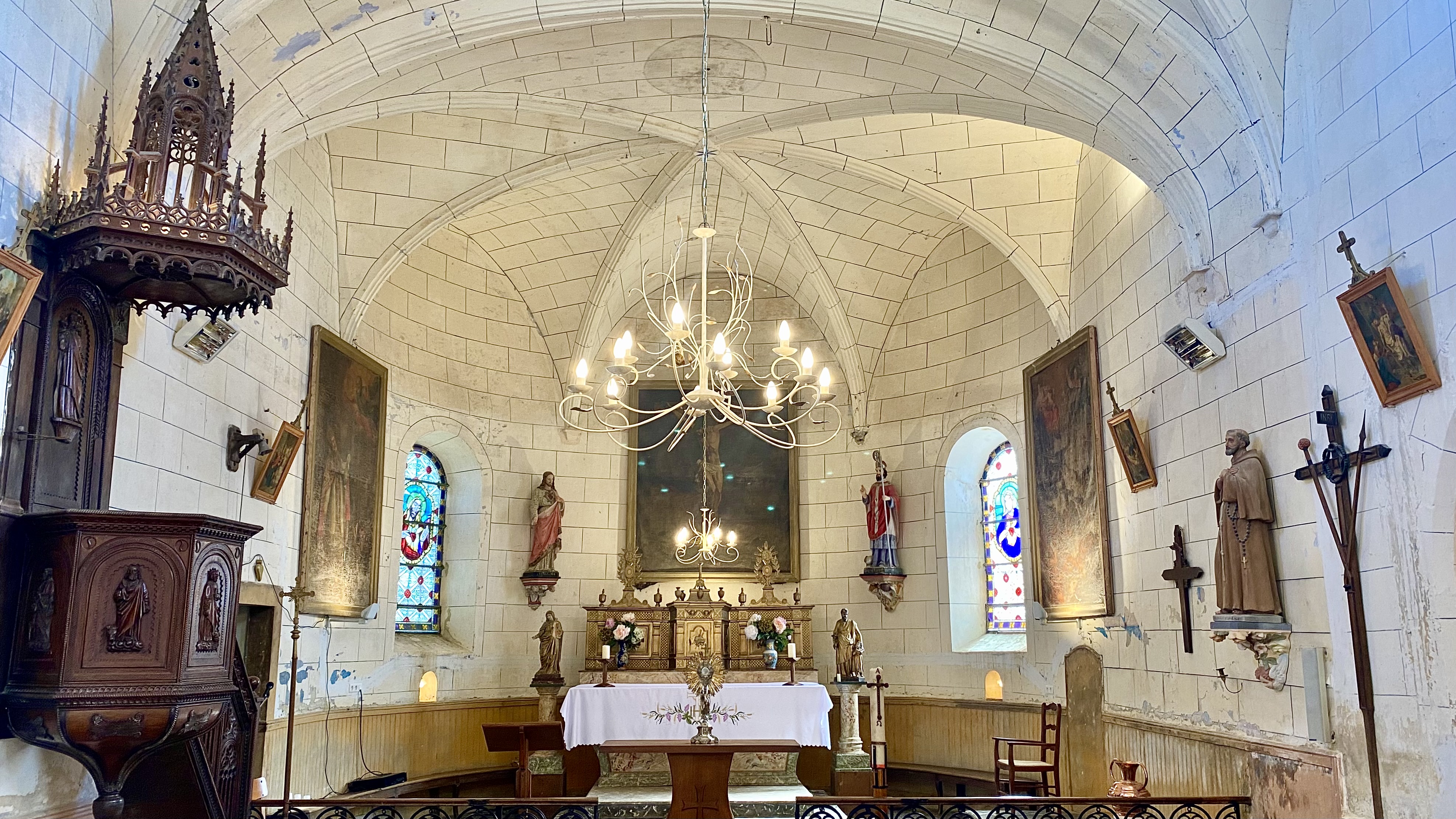 À l’intérieur, la nef unique est ornée d’ogives en bois de style néo-gothique et de chapelles latérales dédiées à Notre-Dame et à Saint-Roch. Le mobilier religieux est particulièrement remarquable : retables, statues baroques, chaire néo-gothique, peintures monumentales de la Crucifixion et de la Vie de Saint Martin, ainsi qu’un précieux ostensoir. Ces éléments confèrent à l’église une atmosphère à la fois sobre et majestueuse, propice à la découverte culturelle et spirituelle.