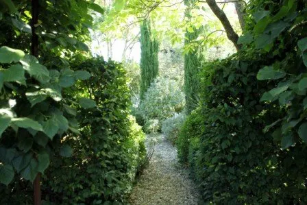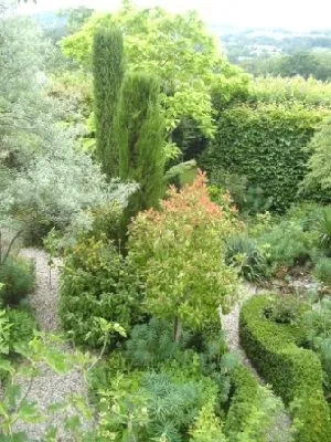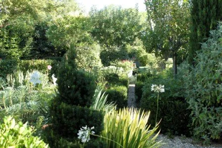 Pour créer la structure il y a des euphorbes, sedam, phlomis, eleagnus, yuccas, buis avec iris, hemerocallis, lysimachia firecracker, echinops, nepata, santolina et de la lavande pour le contraste et la texture. Arbres d’alignement, arbustes, allée de tilleuls, cyprès d’Italie, arbustes sculptés. Accès handicapés : partiel.