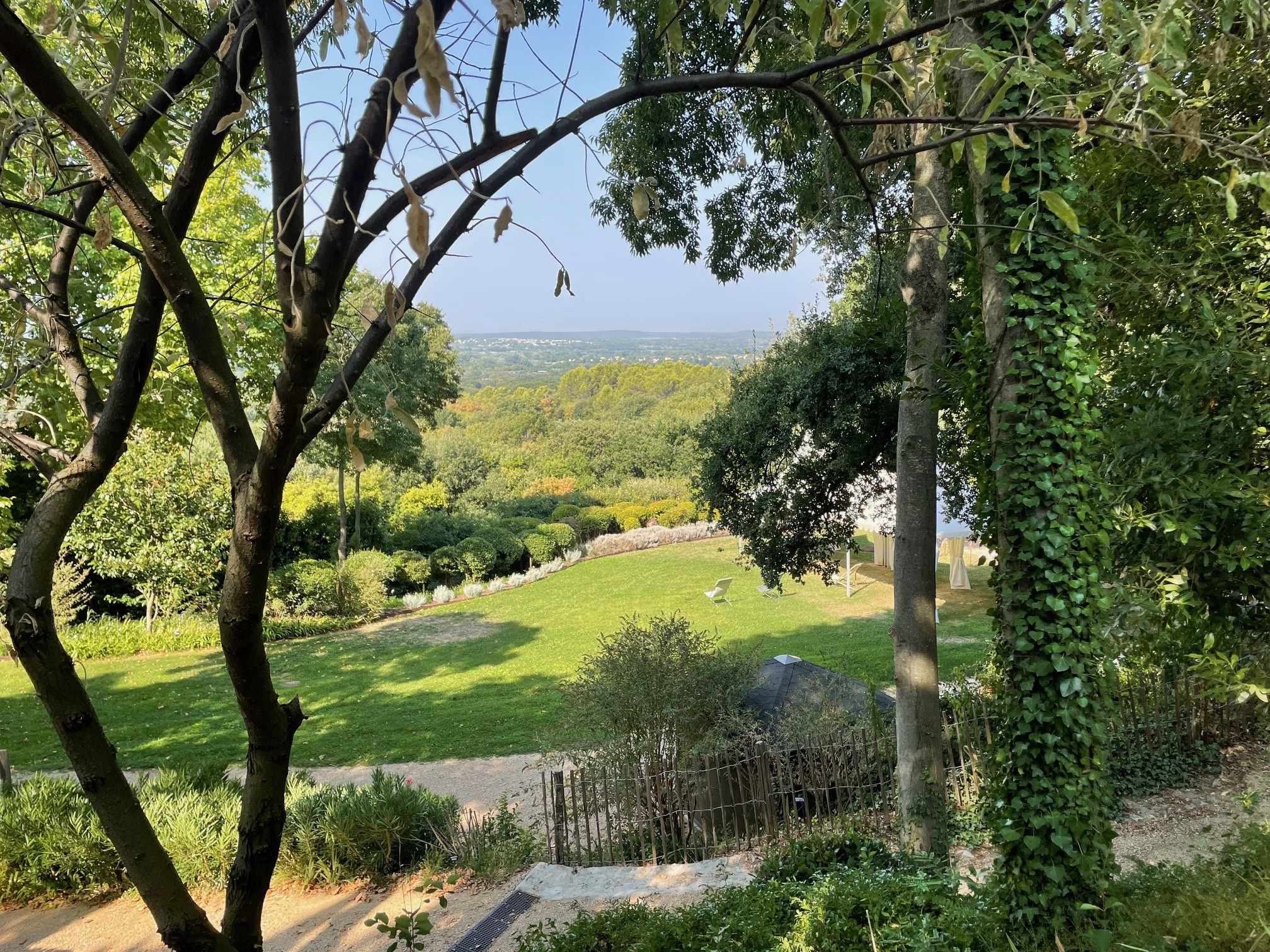 Du théâtre de verdure, créé par Frédéric Sichet, architecte paysagiste, implanté à flanc de coteau, on découvre une très belle vue sur la plaine et le duché d’Uzès.