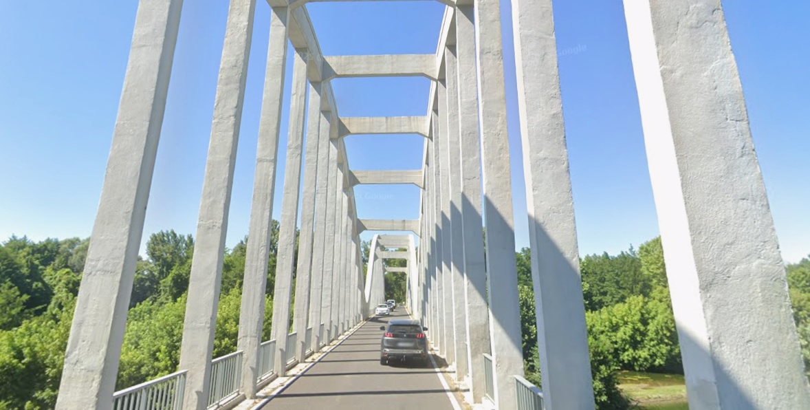 C’est un pont bow-string, c’est à dire le même principe qu’un arc. L’avantage de ce pont est que les efforts d’appuis ne sont que verticaux et le faible encombrement sous le tablier permet aux embâcles de passer facilement en cas de crue.