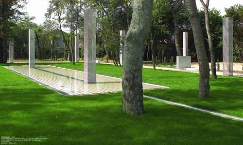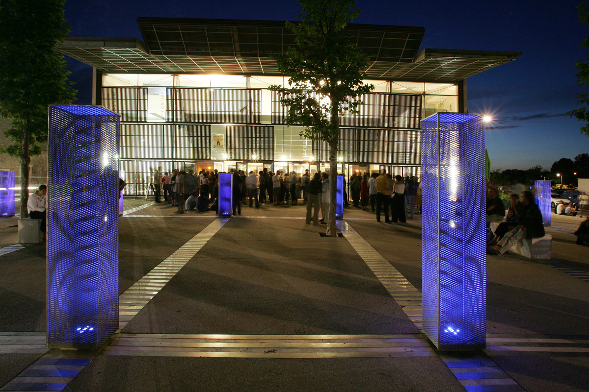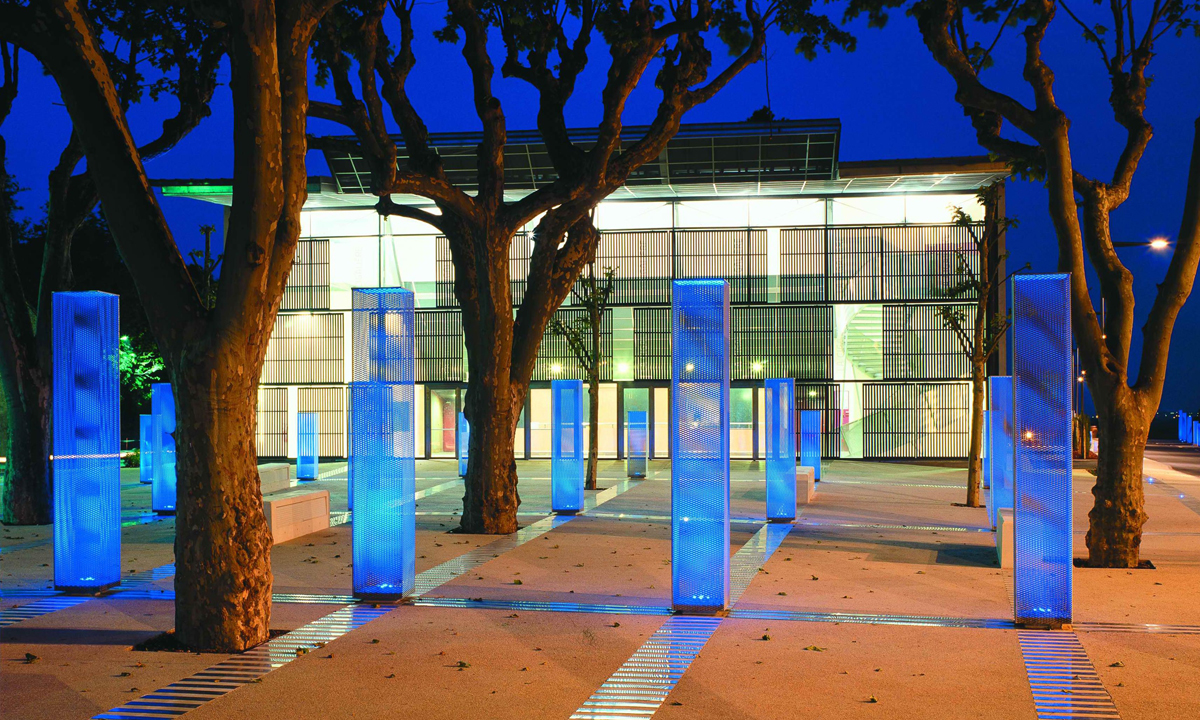 Daniel Buren a aménagé les alentours de La Cigalière en collaboration avec l’architecte Nicolas Guillot. L’oeuvre se dilate « en éventail » en direction de la plaine biterroise : sur près de trois hectares, 170 pylônes en métal ajouré sont déployés dans l’espace pour guider notre regard vers l’horizon. C’est un véritable spectacle à la tombée de la nuit, lorsque les pylônes, éclairés de l’intérieur par fibre optique, prennent des variétés infinies de couleurs.