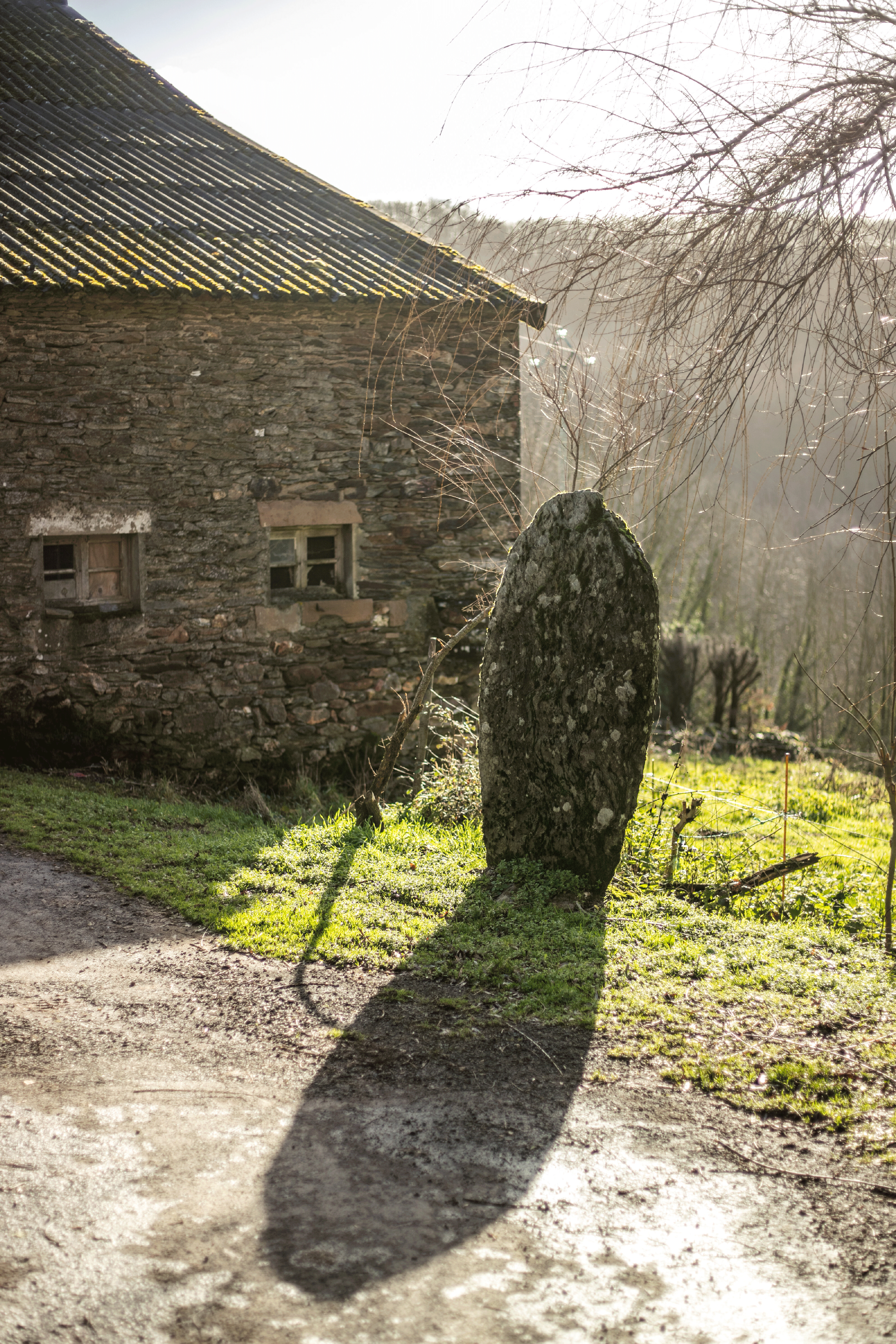 Statue-menhir près d’un bâtiment en pierre, l’hiver – © Margaux Ricard photographe – HTOÀ propos