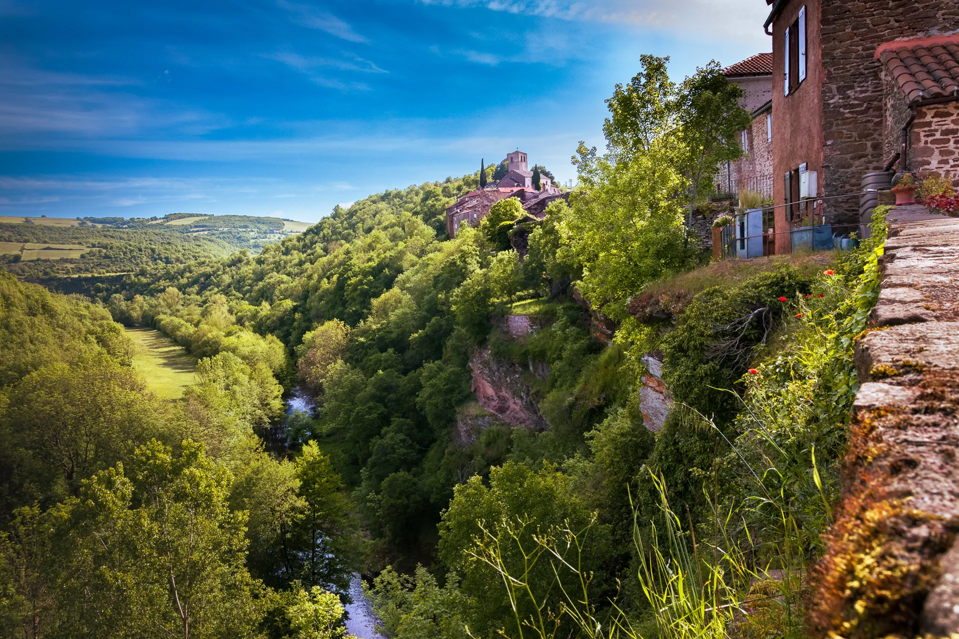 Le village de Combret est construit sur un éperon rocheux très étroit baigné par un méandre du Rance.