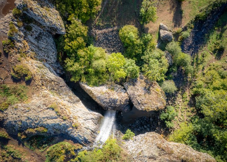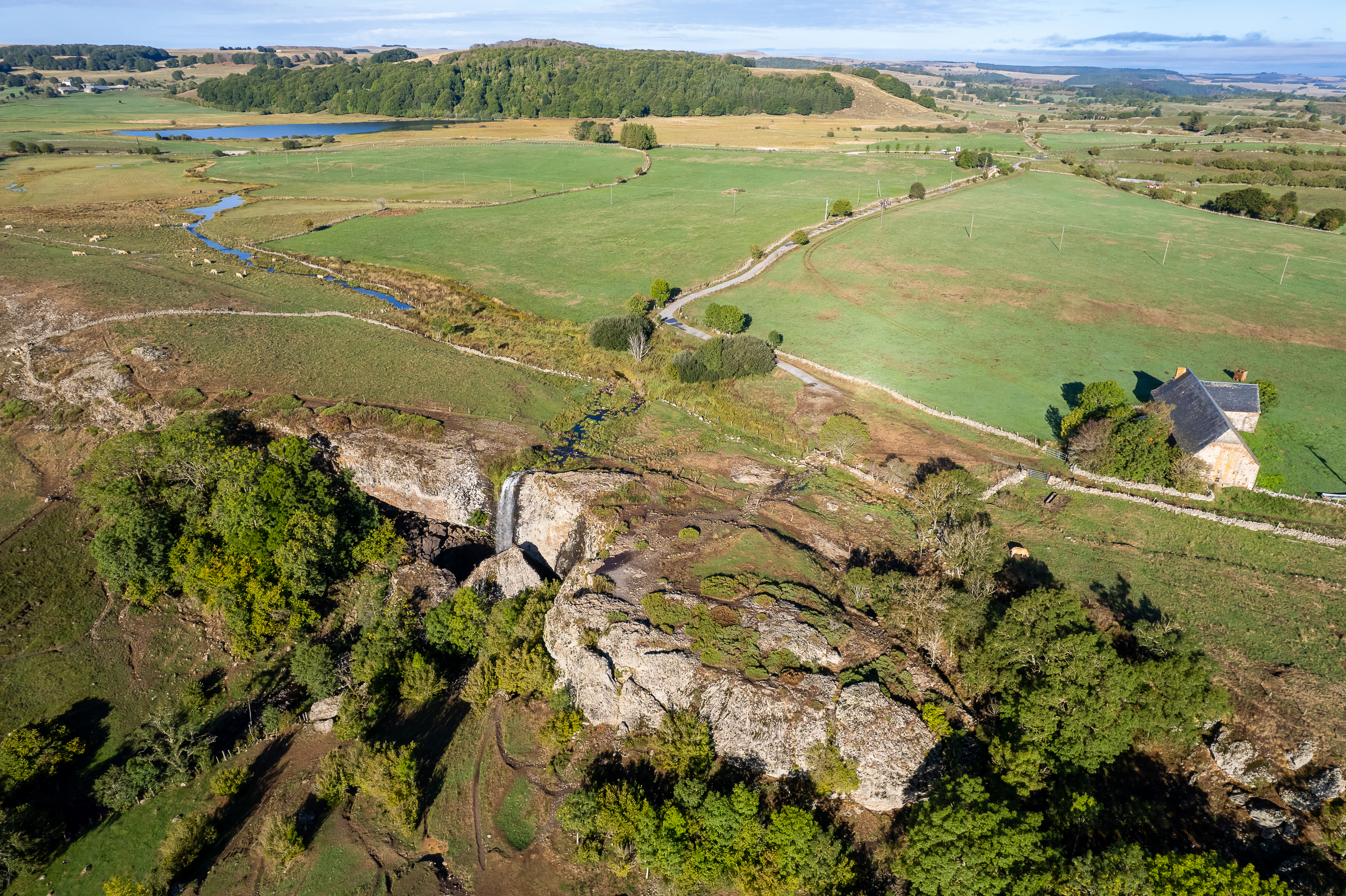La Cascade du Déroc est l’un des sites naturels les plus spectaculaires de l’Aubrac. Haute de 33 mètres, elle domine la vallée de la Gambaïse. En effet, les eaux du lac des Salhiens et d’un affluent du Bès se précipitent sur une falaise de basalte. Sous la chute d’eau, une grotte aux orgues basaltiques révèle des formations géométriques uniques. De plus, la cascade est facilement accessible. Vous pouvez emprunter la boucle balisée depuis Nasbinals, le PR “Du Déroc à la Peyrade”, ou simplement vous garer sur le parking en bord de route. Ainsi, la Cascade du Déroc fait partie des plus belles cascades de l’Aubrac et illustre parfaitement le patrimoine naturel de la région.