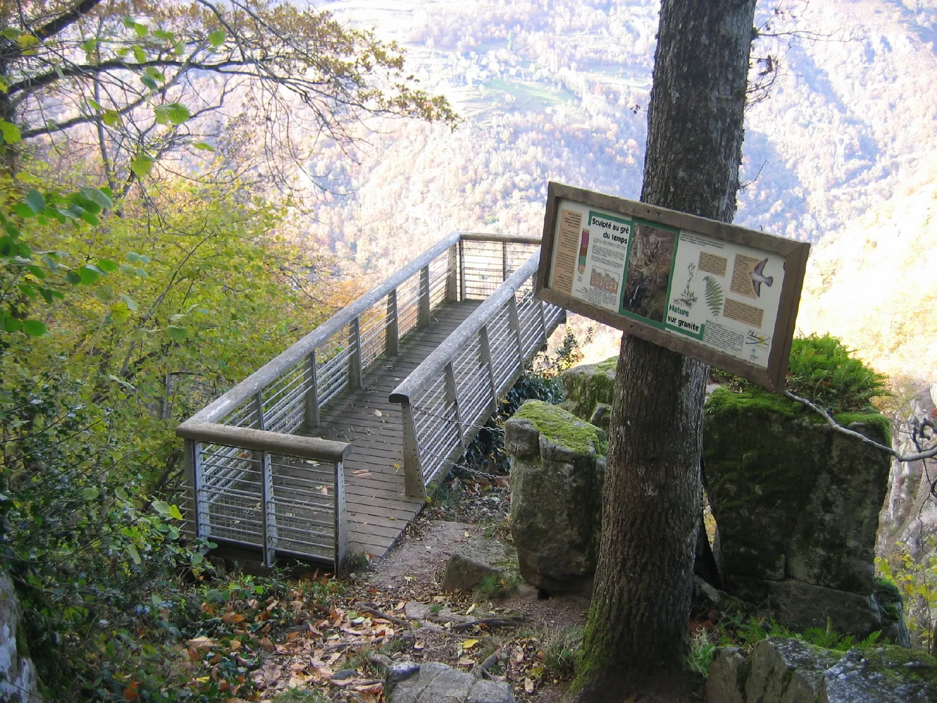 Deux plates formes ont été spécialement aménagées en surplomb, ce qui permet aux promeneurs de découvrir un peu mieux ce décor pittoresque, d’apercevoir en contre bas la retenue de Couesque sur la Truyère, et également sur un piton, de l’autre côté, le petit village de Valon avec son château datant du XIIe siècle.