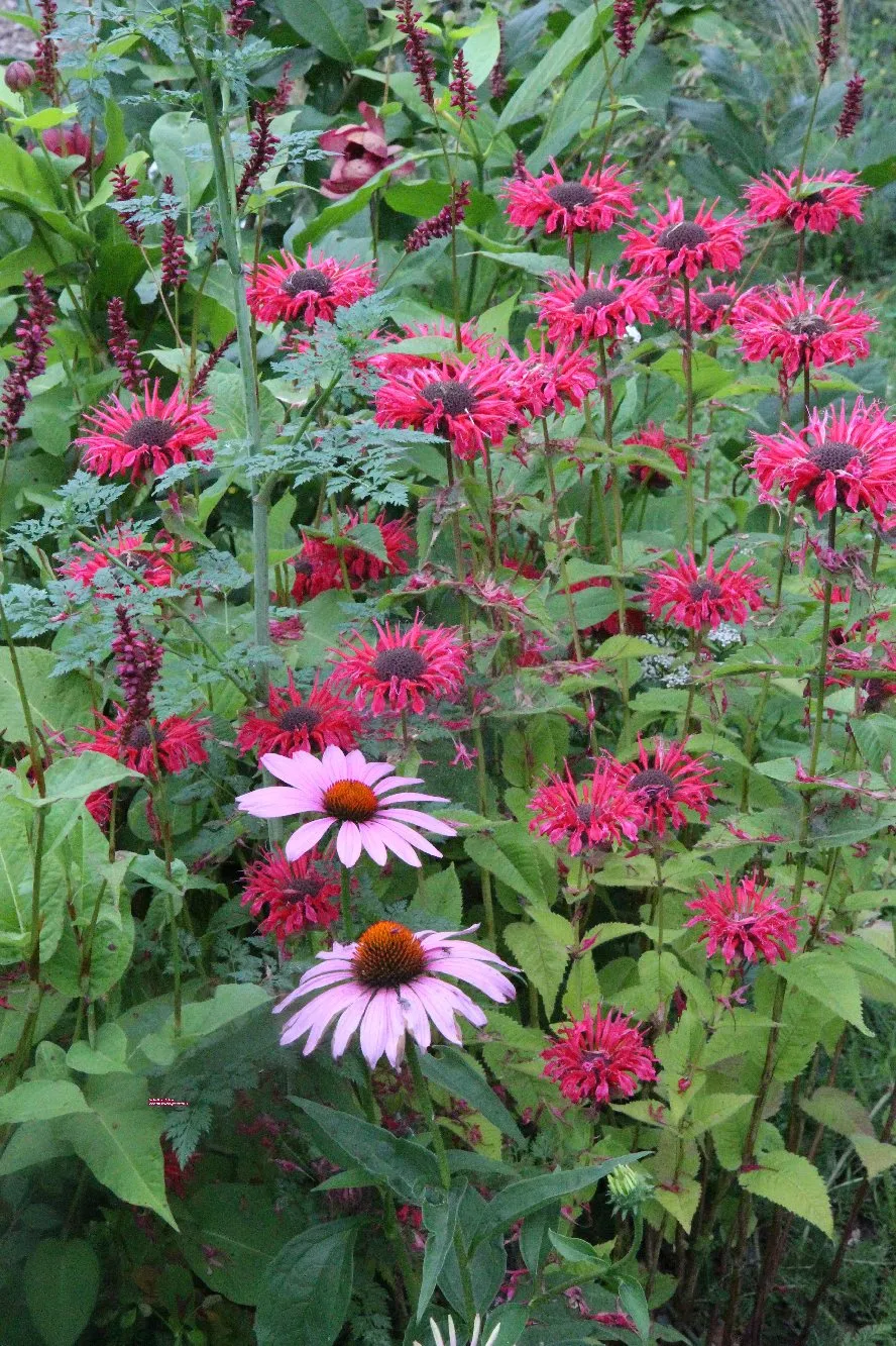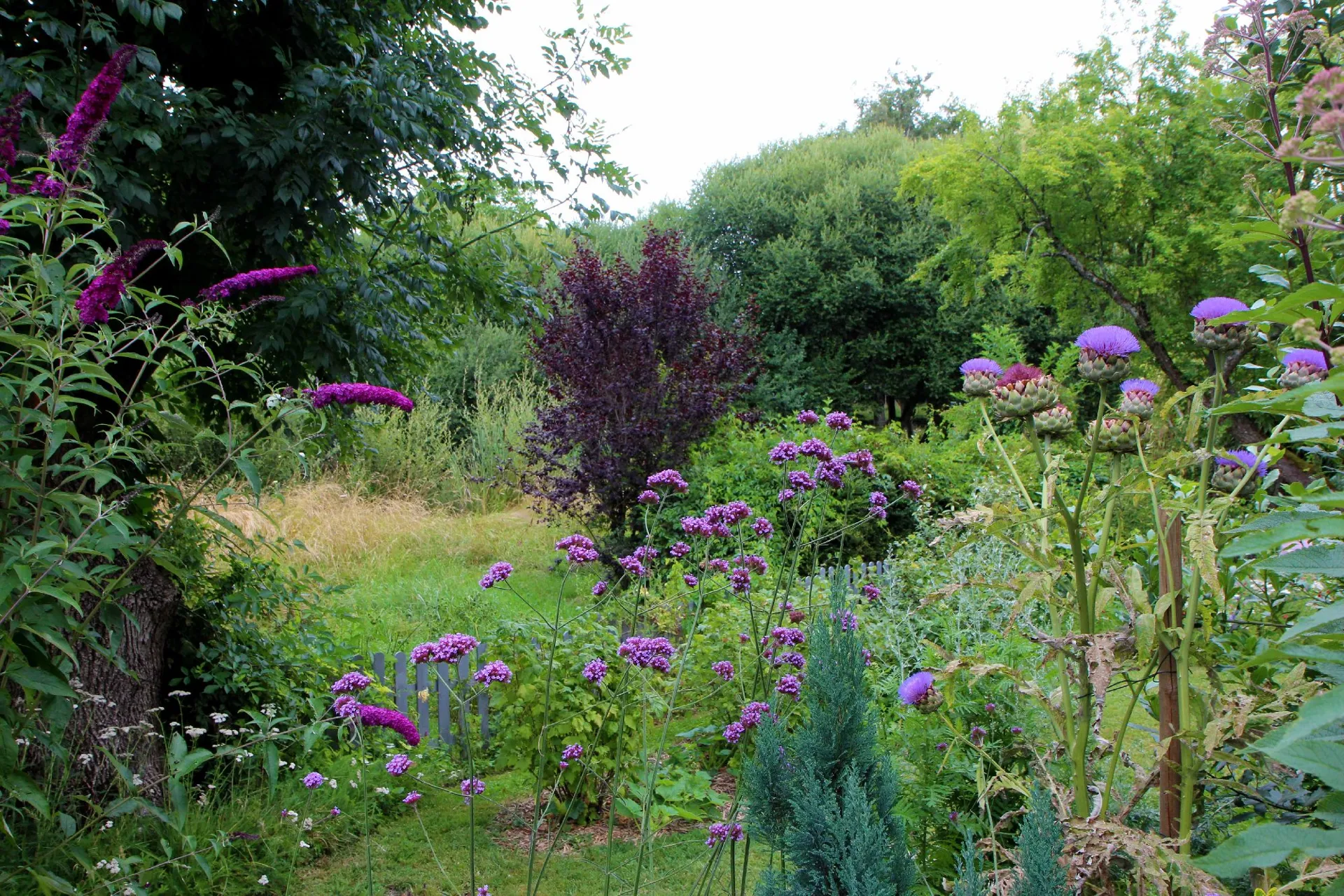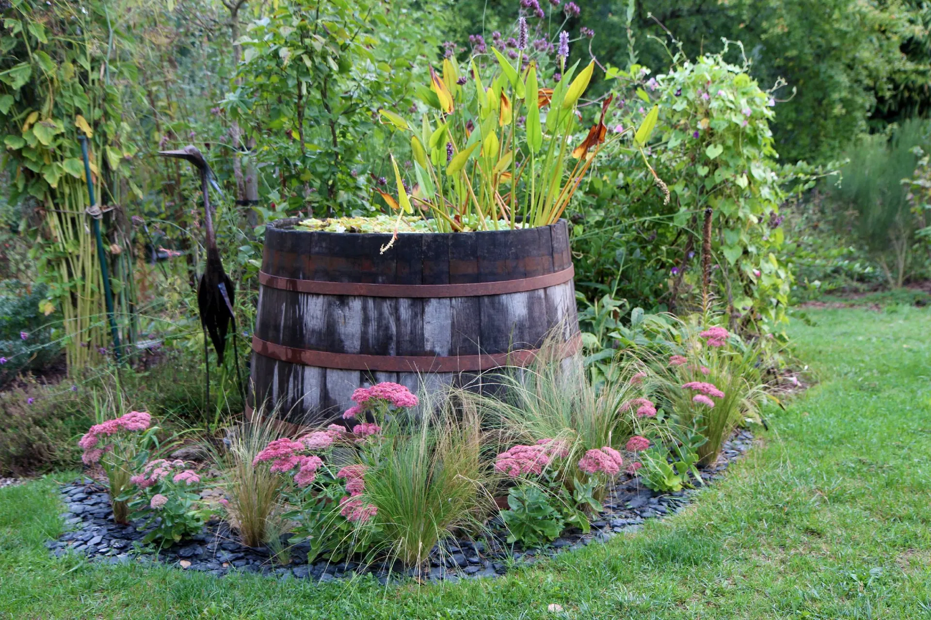 Nous tentons de mettre en place des guildes de plantes qui s’accordent des bénéfices mutuels, pratiquons le compostage en place, (les déchets de cuisine sont placés à même le sol dans les massifs et le potager, disposons de 4000 litres d’eau collectée qui suffisent à combler les besoins de nos plantes.