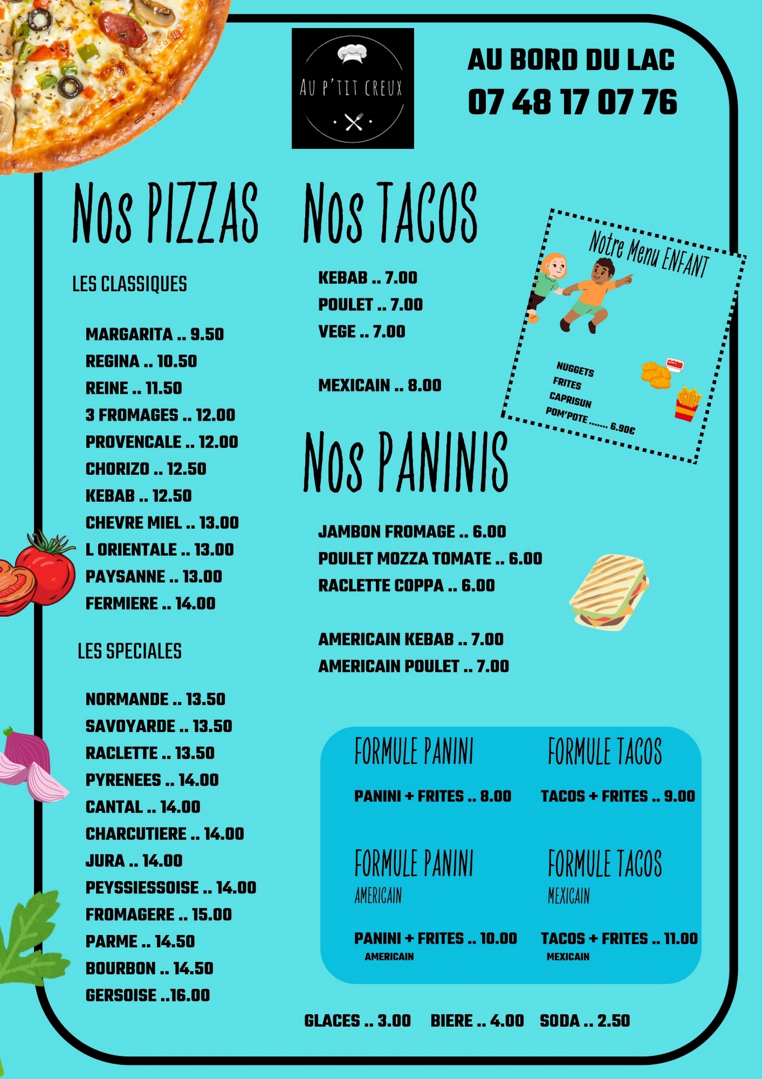 Après une balade autour du lac de Peyssies, Laetitia et Sébastien proposent plusieurs plats à emporter ou sur place dans un cadre magnifique : pizzas, tacos, paninis, salade ainsi que tout simplement une glace ou un soda.