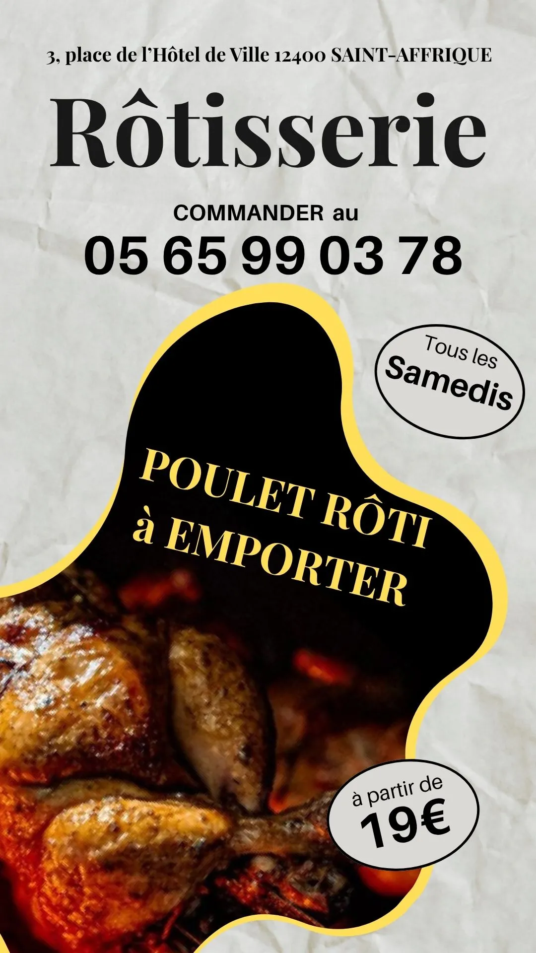 Pas de panique : commandez votre poulet rôti bien doré à emporter, prêt à déguster avec ses accompagnements. Goûteux, pratique… et convivial à souhait !