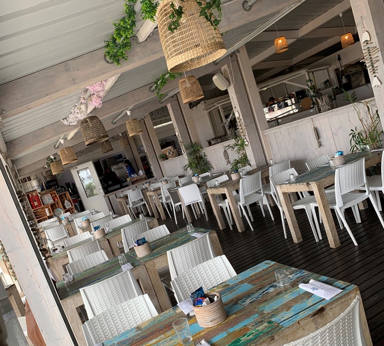Restaurant et bar de plage, cuisine méditerranéenne et traditionnelle, salades, grillades, cocktails.
