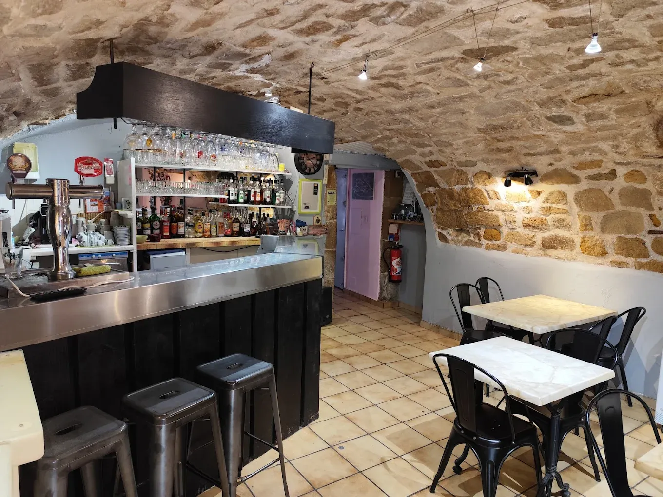 Dans la salle voûtée en pierre, la fraîcheur naturelle des murs caussenards se mêle au parfum du plat du jour qui mijote en cuisine. Le décor est simple et chaleureux : bois, pierre et lumière douce créent une atmosphère apaisante.