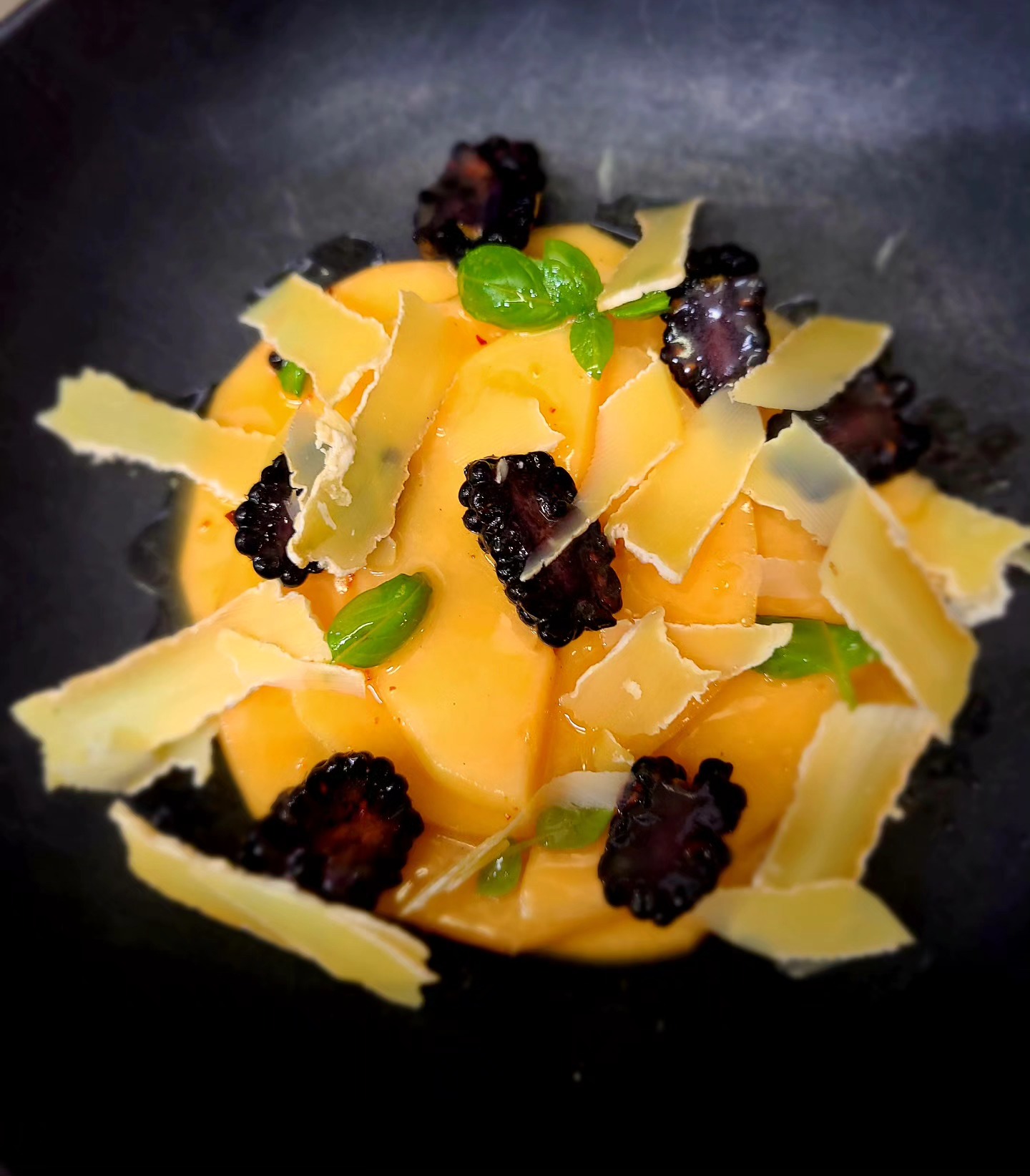Carpaccio de melon vinaigrette au miel-mûres – © @ChezTuf