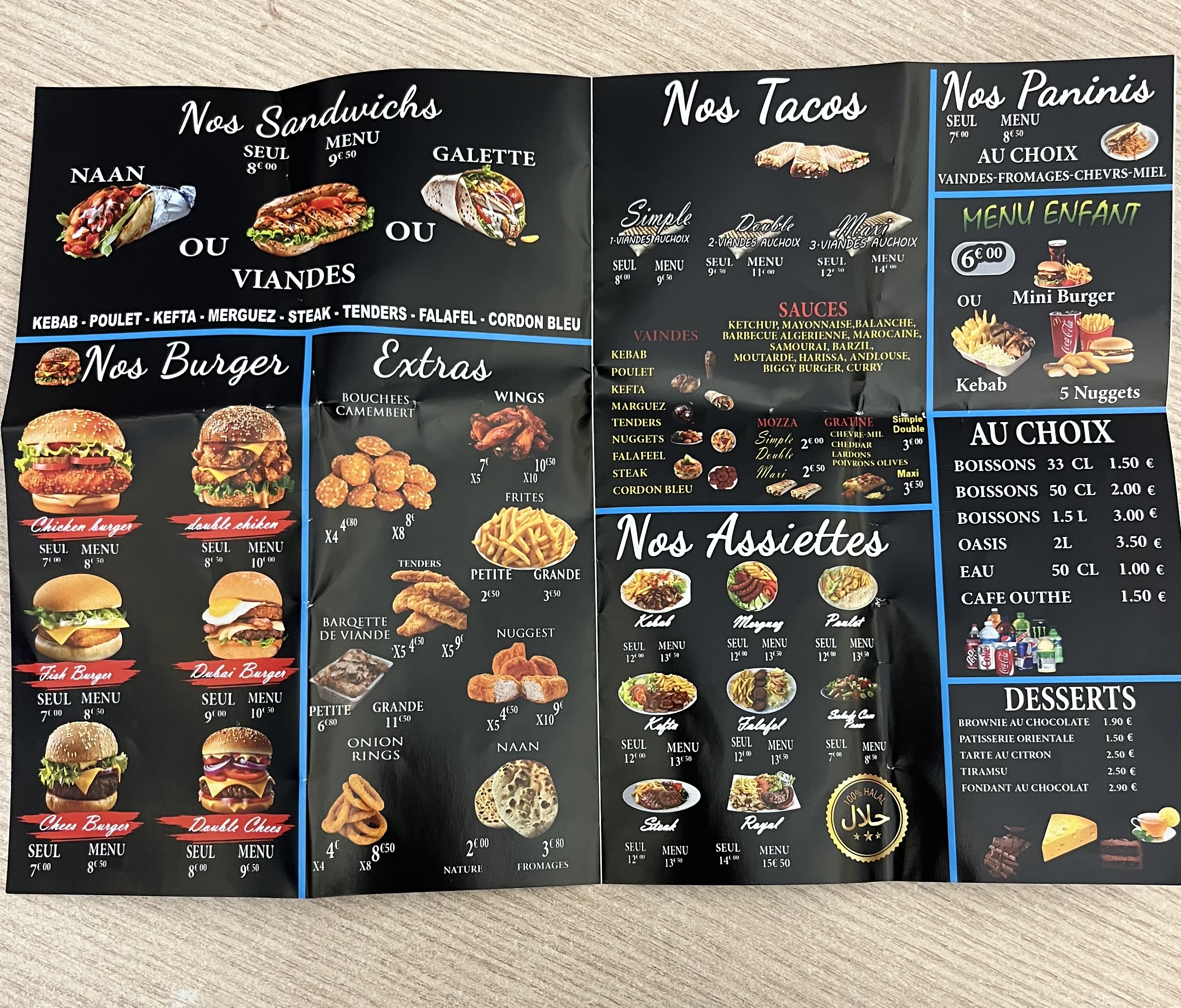 Sandwichs naan ou viandes ou galette , burgers, Tacos simple double ou triple viandes, paninis, bowls…