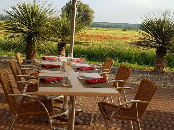 Le décor ? Plutôt moderne, chaleureux. Et du printemps à l’automne, les clients se régalent de profiter de la terrasse couverte, avec sa vue sur les vignes.