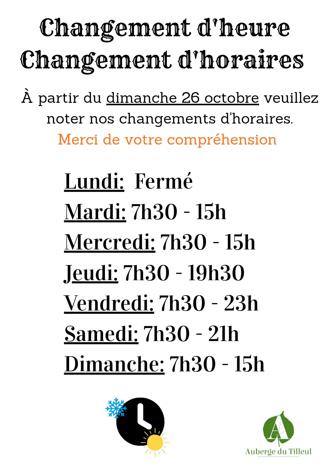L’auberge du Tilleul vous propose une cuisine comme on l’aime : traditionnelle, familiale, généreuse en semaine et des repas à thèmes autour d’un brasero ou d’un cochon farci cuit à la broche ( point presse et vente de carte de pêche) .