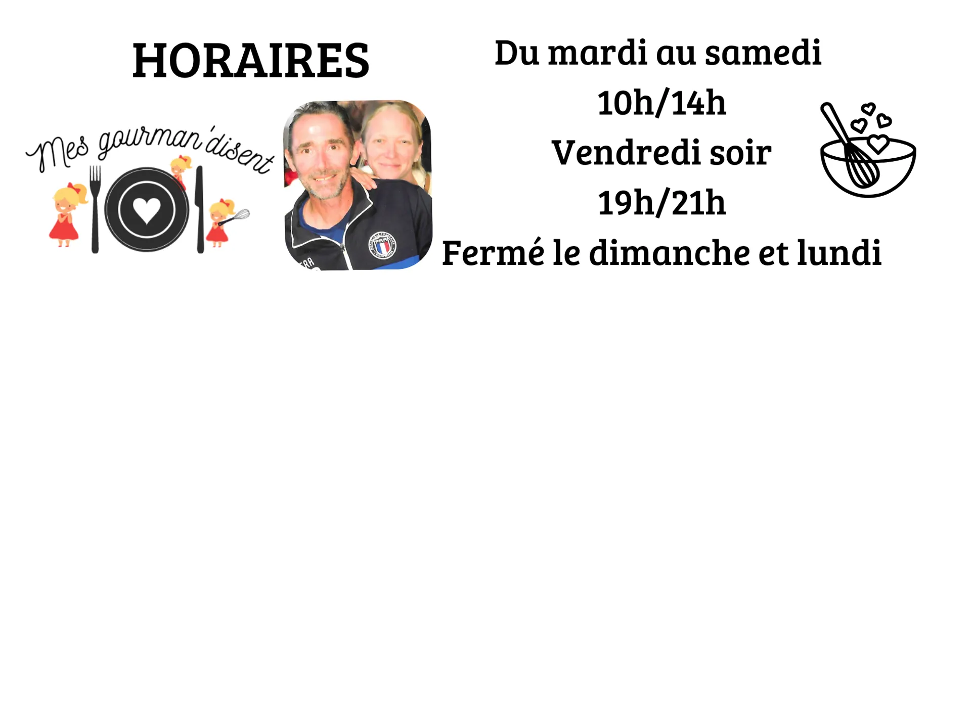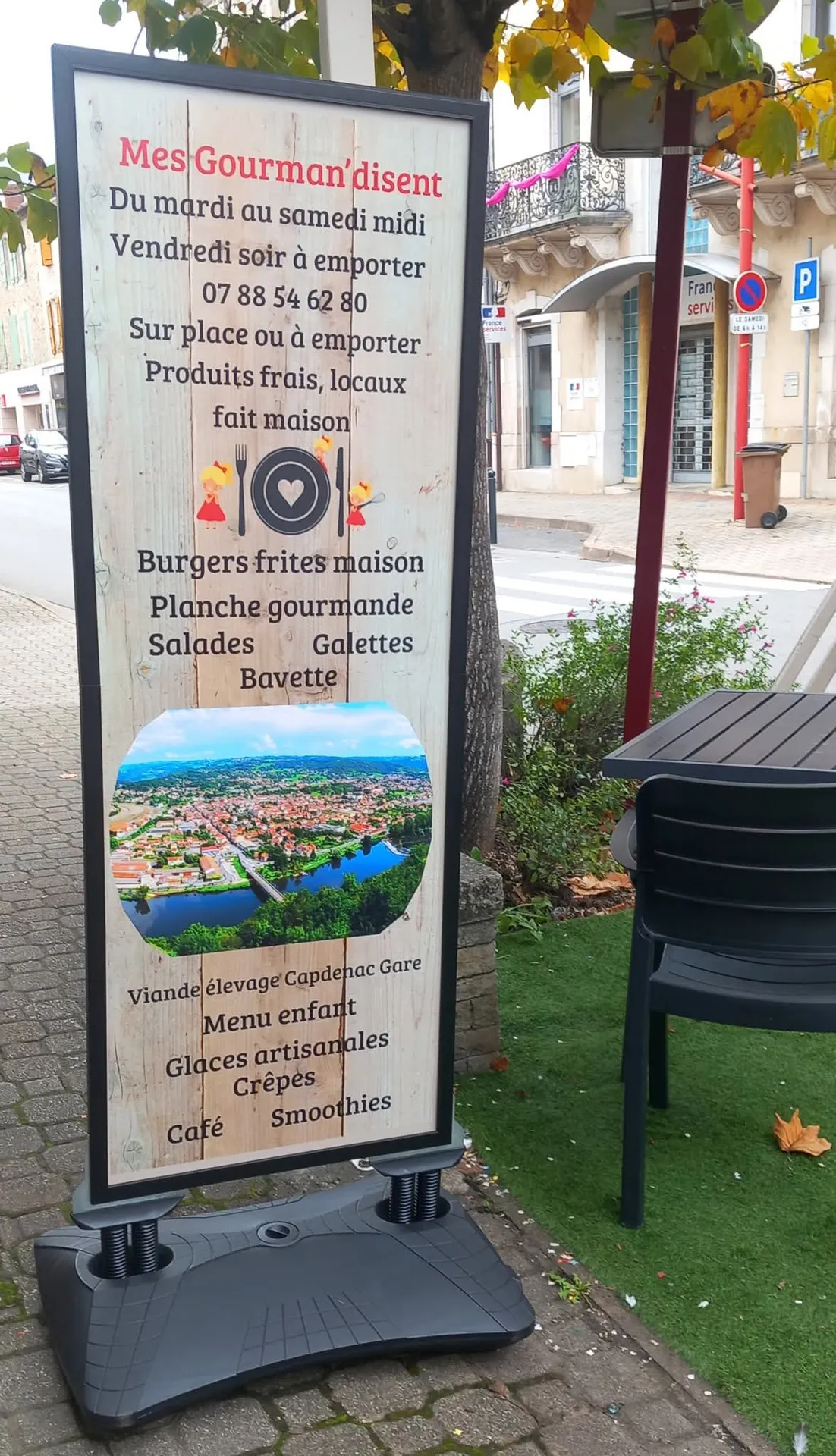 « Mes gourman’disent » propose des plats frais fait maison en circuit court. Salades, assiette gourmande, bavette, burgers frites, galettes (menu enfant proposé) glaces, crêpes, smoothies. Sur place ou à emporter. Bière Vin local. Ambiance familiale.