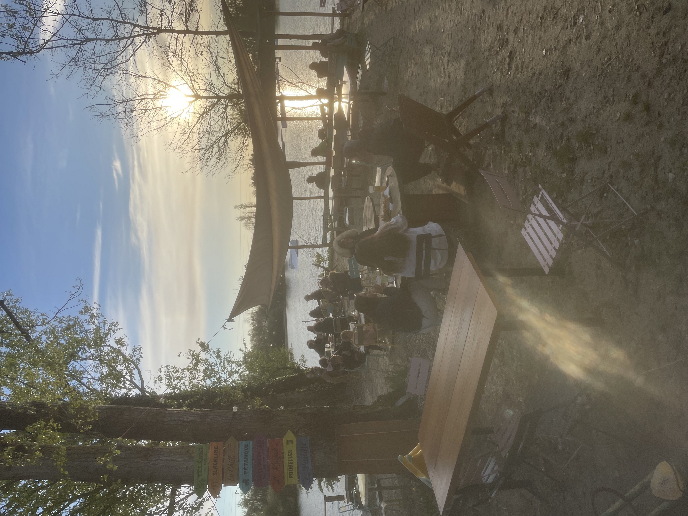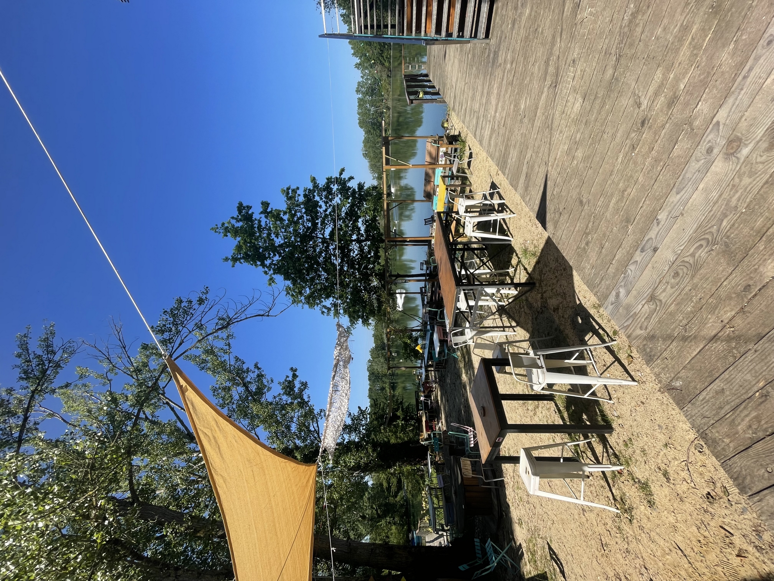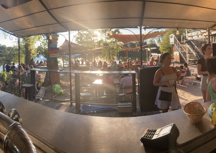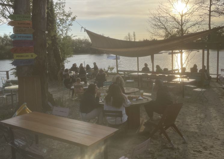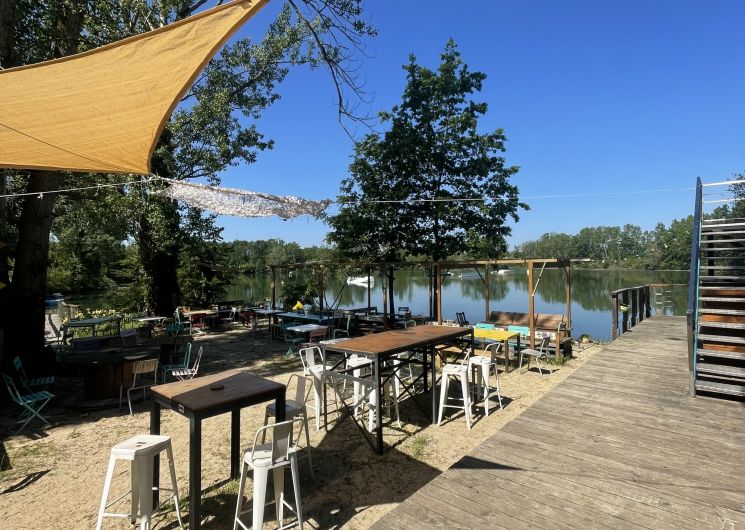 Une grande terrasse ombragée vous accueille pour vous restaurer ou simplement boire un verre avec une magnifique vue sur le lac et les pieds dans le sable.