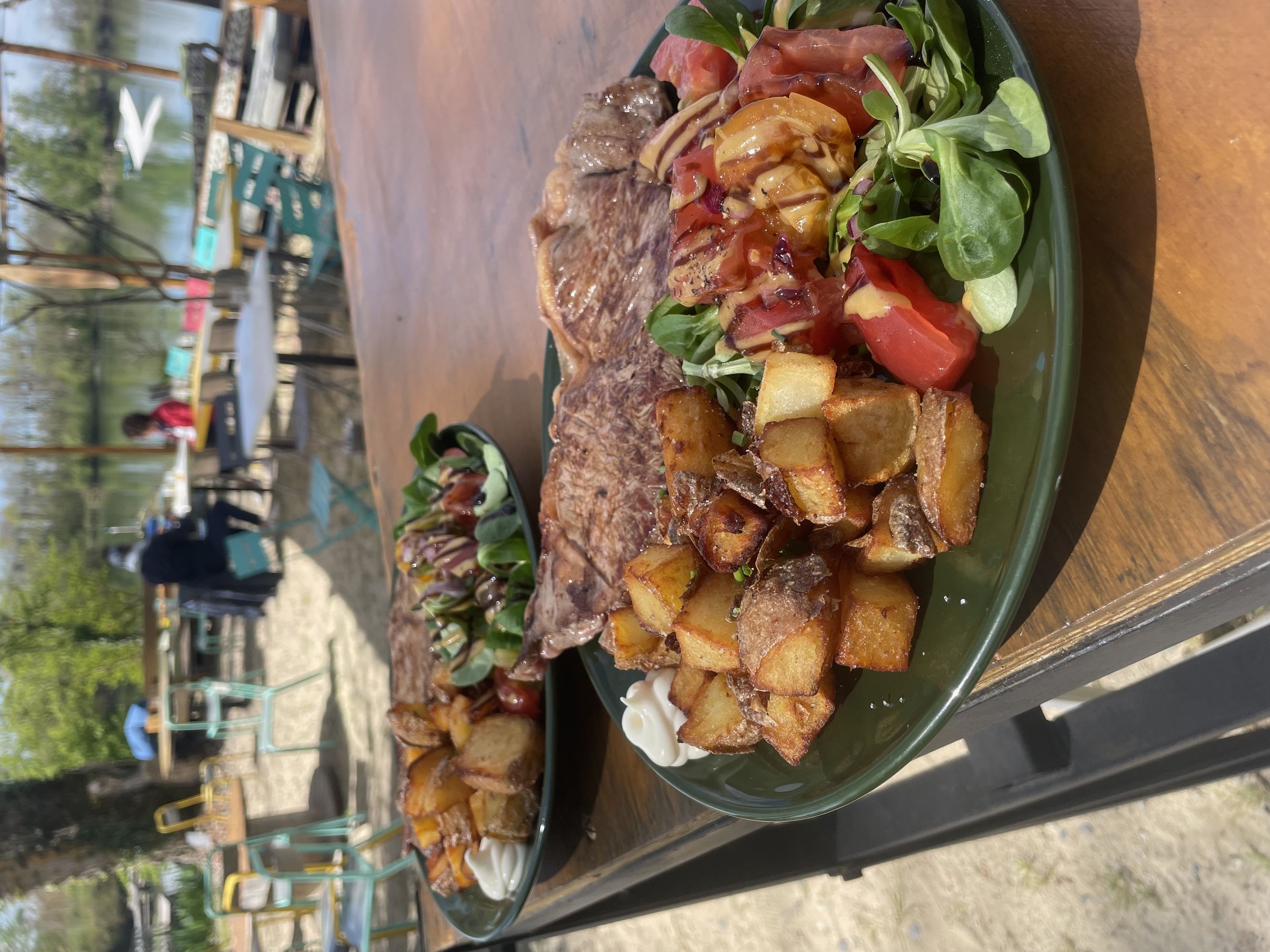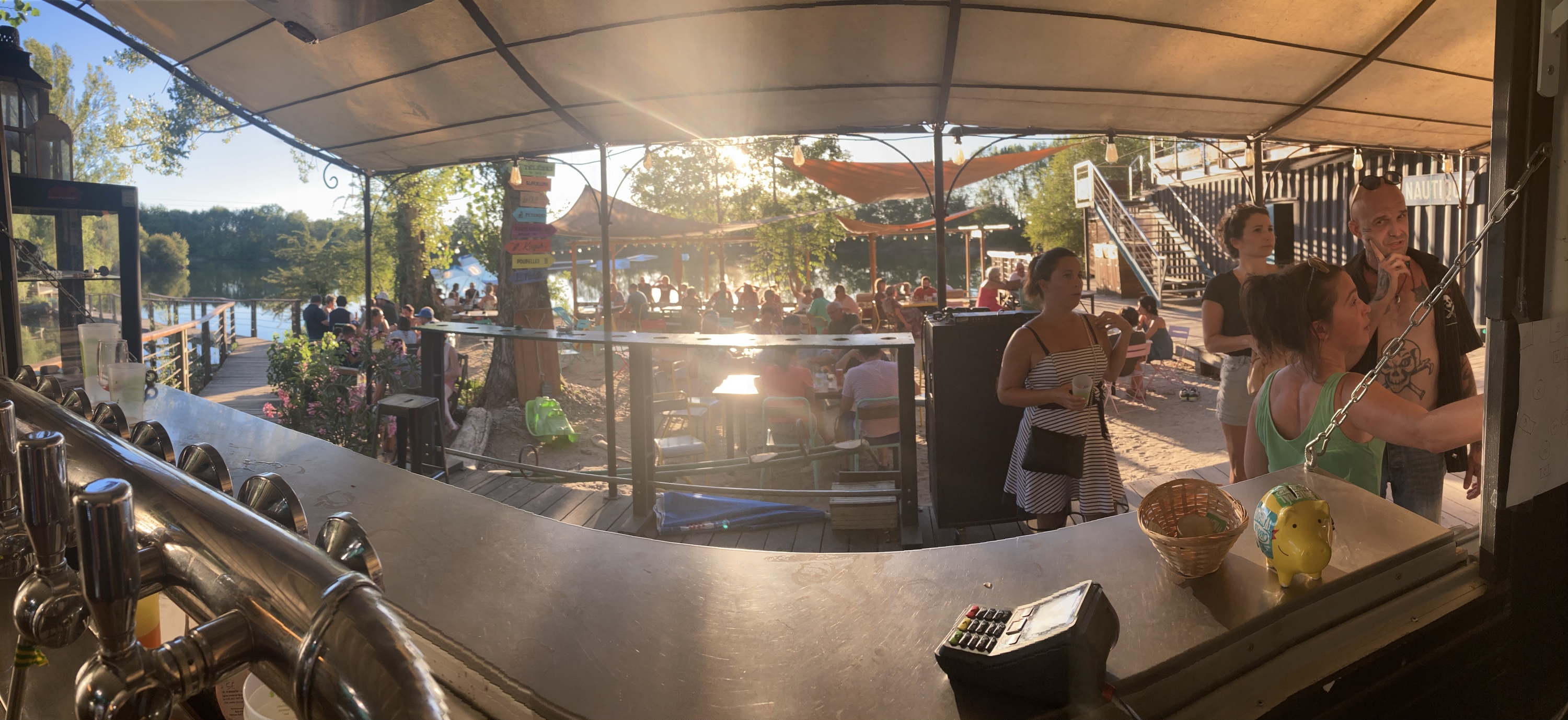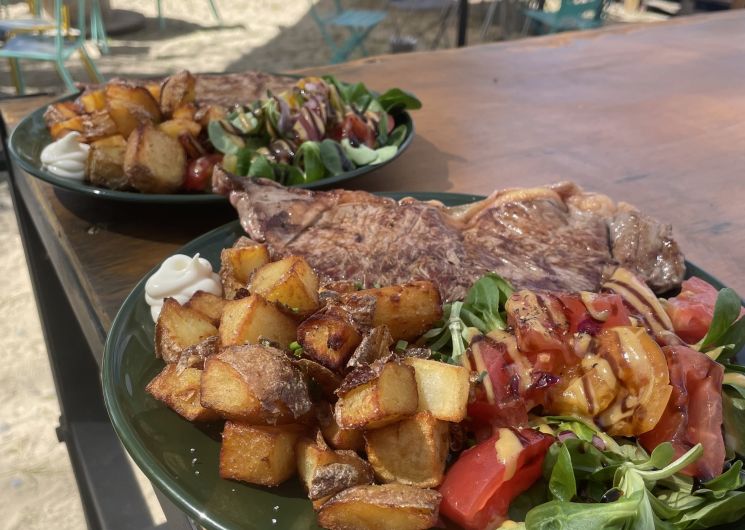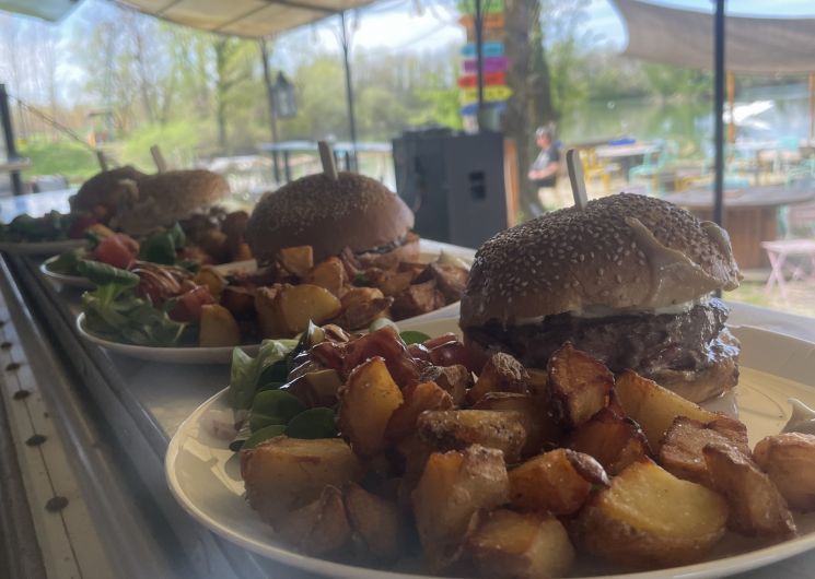Une grande terrasse ombragée vous accueille pour vous restaurer ou simplement boire un verre avec une magnifique vue sur le lac et les pieds dans le sable.
