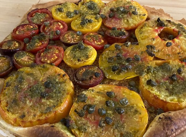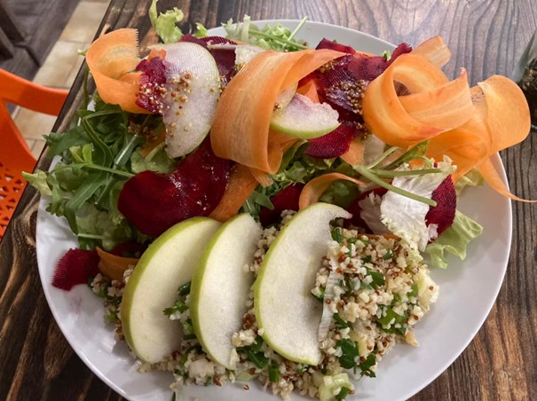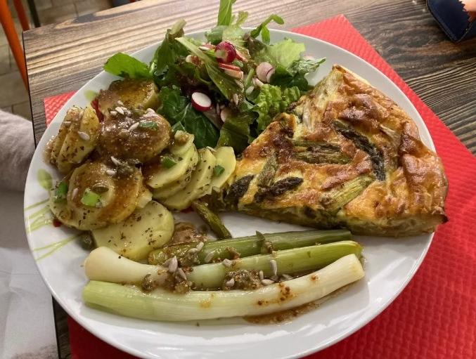 La formule déjeuner est composée : d’une tarte salée accompagnée de crudités et d’un dessert (la plupart du temps végétarien).