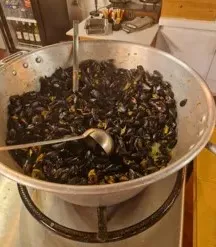 Snack-bar: frites maison ,croque monsieur, pizza le vendredi sur place ou a emporter……, ) A la carte: salade ,bavette du boucher du village voisin, Glaces ,desserts maison ( mousse chocolat ,crème brulée…..)