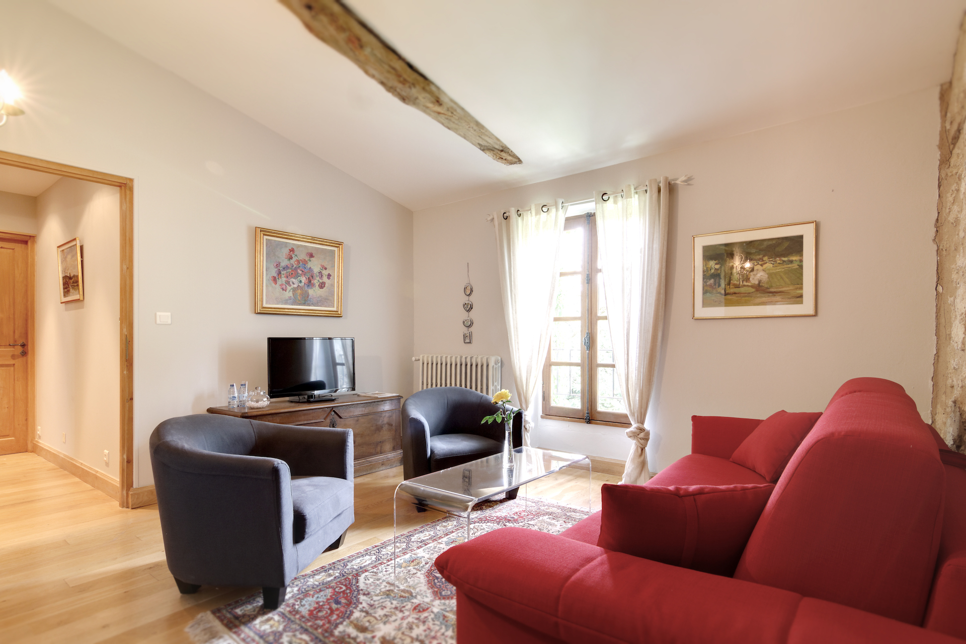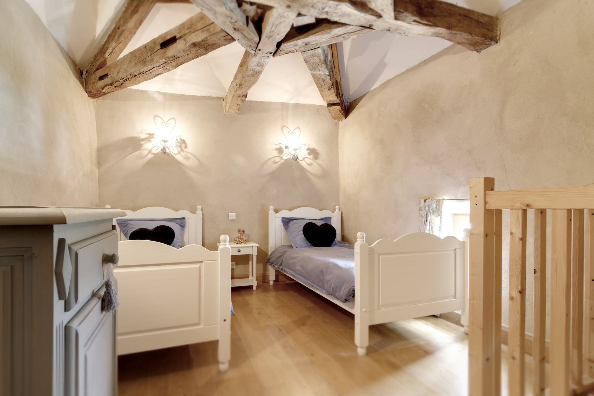 – Suite Aramis et d’Artagnan au 1er étage (2 à 4 personnes), chambre parentale avec 1 lit 160 séparable en lits jumeaux, salon TV spacieux ; dans la tour, chambre d’enfants avec 2 lits en 90, deuxième salle d’eau et WC.
