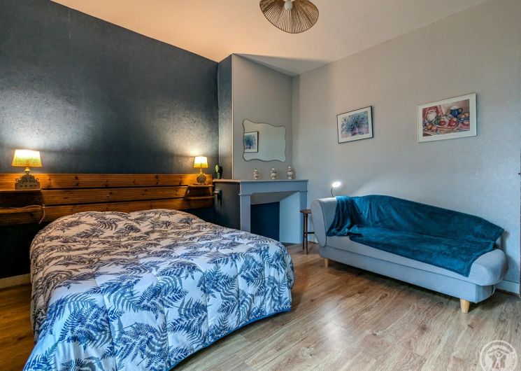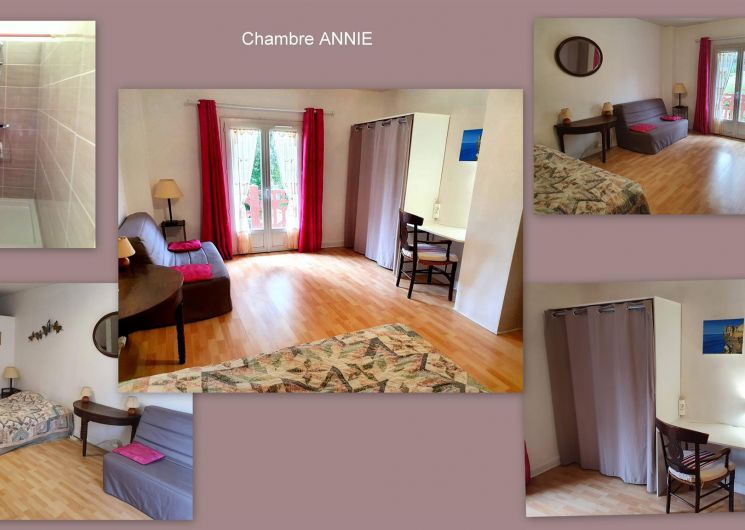 – au 1er étage : chambre Mireille et Jean (1 lit 2 personnes en 140cm + convertible en 140cm + dressing + salle d’eau, chambre Monique (1 lit 2 personnes en 140cm), chambre Claude (1 lit 2 personnes en 140cm + 1 lit méridienne en 80cm), salle de bains. 1/2 palier supérieur : chambre Annie (1 lit 2 personnes en 140cm + 1 canapé convertible 140cm + salle d’eau + balcon).