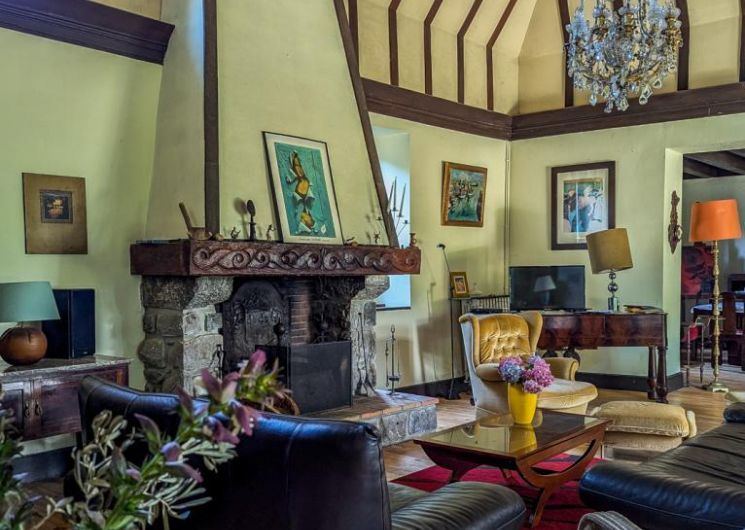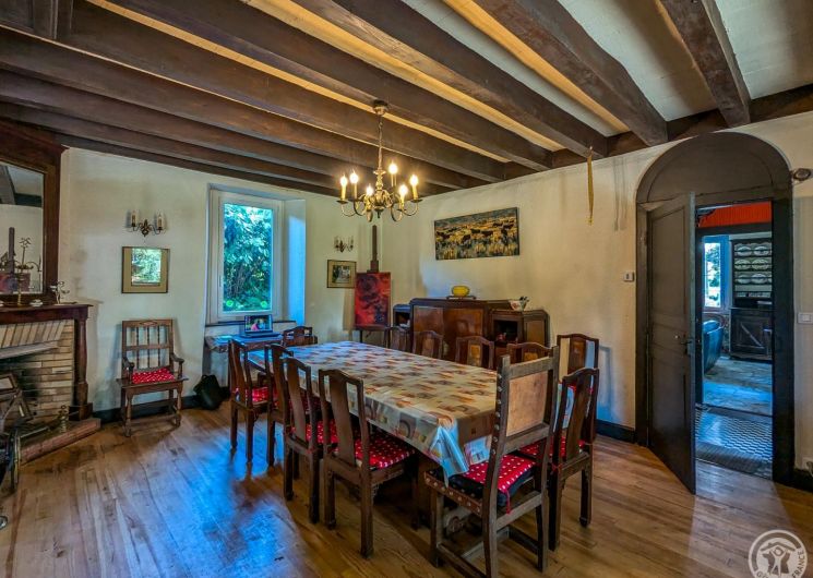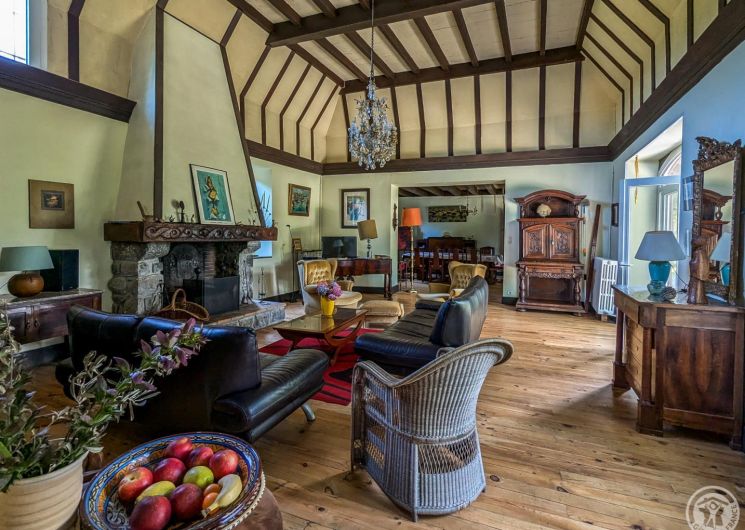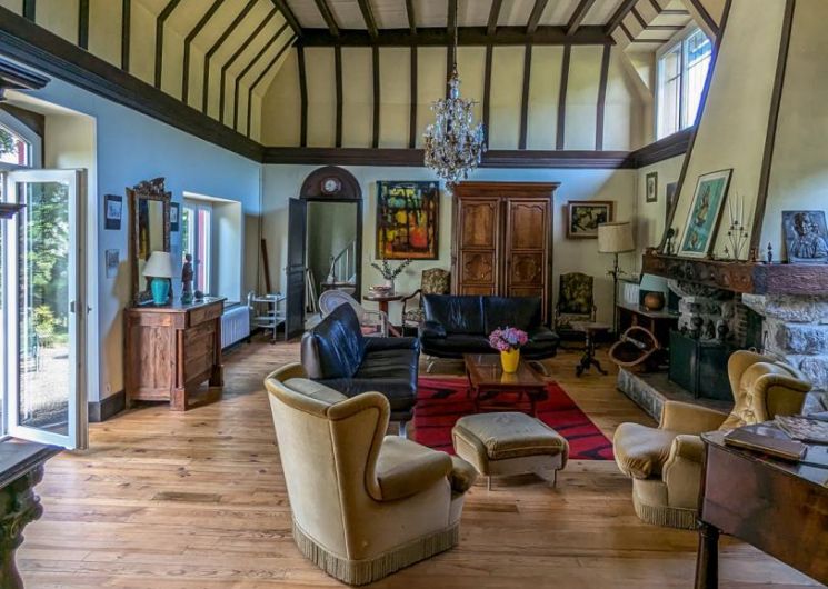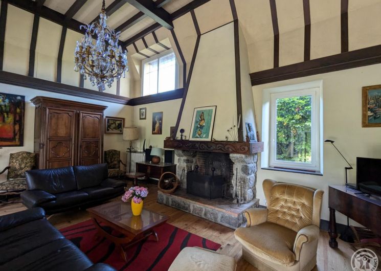 – au rez-de-chaussée : hall d’entrée, cuisine, grand séjour(80m2, avec cheminée), chambre/bureau Jean (canapé convertible en 140cm, grand bureau, chaine hifi et TV), WC.