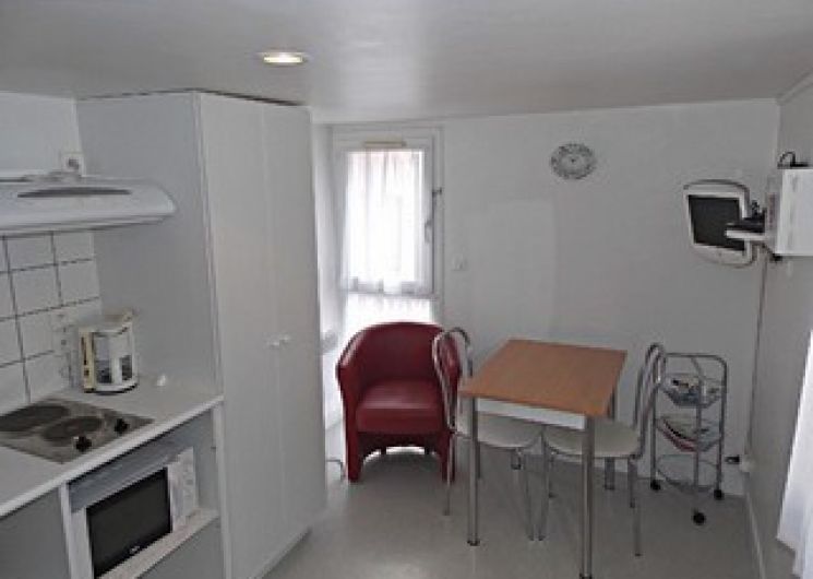 Studio 1 personne 18m2, kitchenette ouverte sur séjour équipée micro ondes + petits équipements. Coin salon avec TV couleur. Accès au 1 lit en 90cm par échelle meunière, + rangements. Douche et wc. Terrasse avec salon de jardin. Parking réservé et gratuit. Buanderie collective avec lave linge et sèche linge. Grande cour fermée. Accès à la Résidence avec code sécurisé.